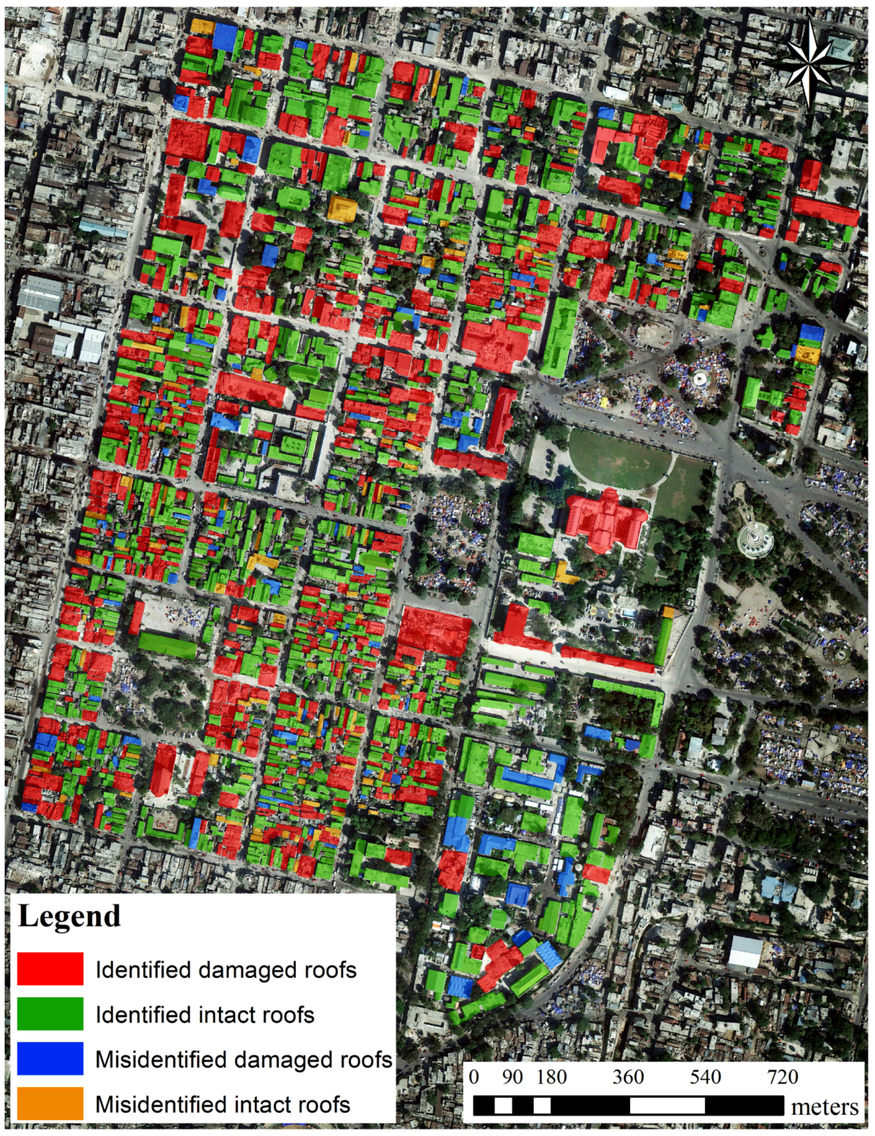 For validation, the results are compared to manually labeled reference data based on remote-sensing-based building damage assessment data on the 2010 Haiti earthquake [73], where buildings were classified using the EMS-98 criteria. In these criteria, safe buildings with intact roofs and damaged walls are given grades of 1–3, and heavily or completely collapsed buildings with damaged roofs are given grades of 4–5 [74]. To evaluate the accuracy of damaged roof detection in this paper, buildings with grades of 1–3 are re-categorized as intact roofs, and buildings with grades of 4–5 are re-categorized as damaged roofs.