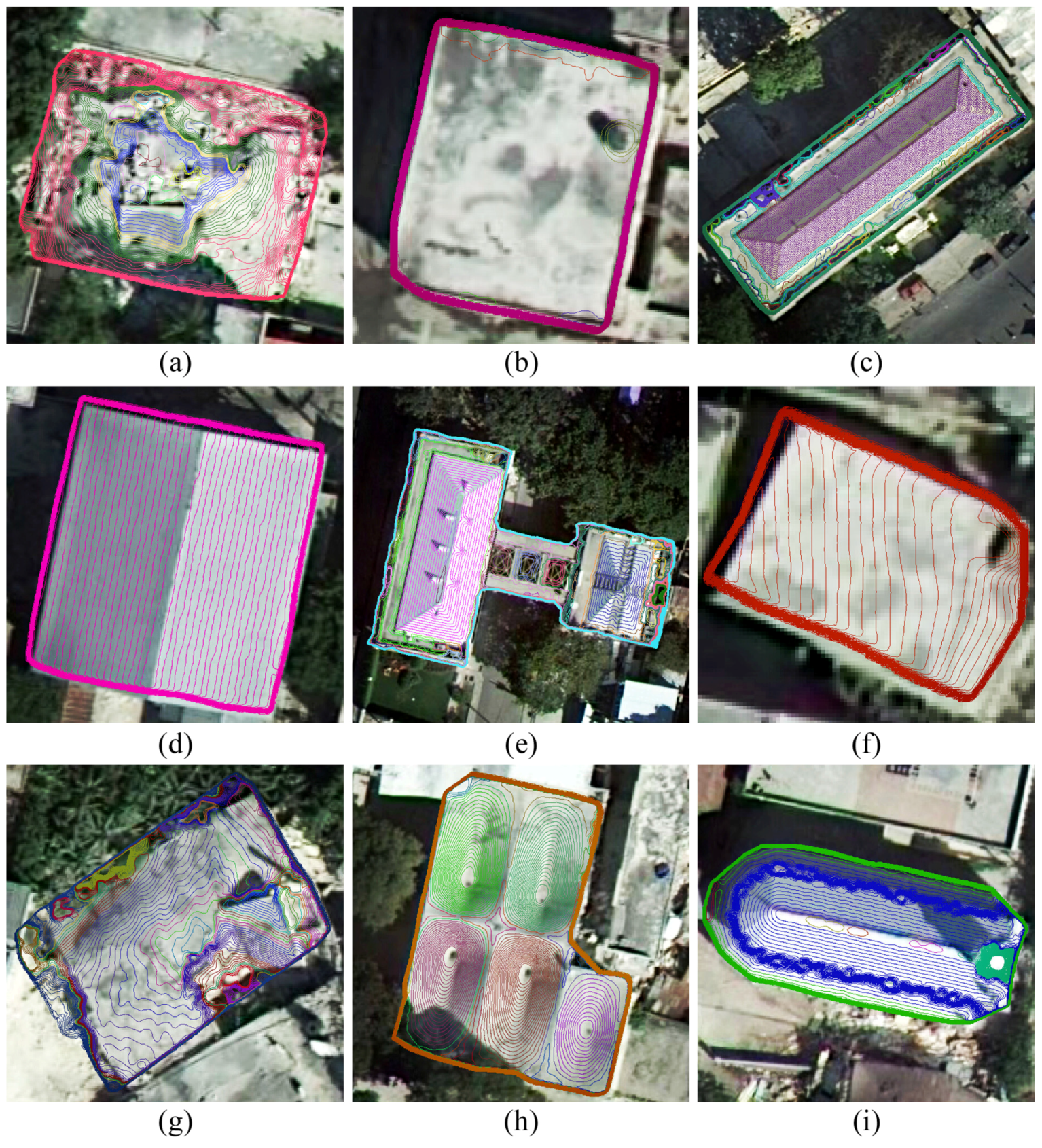 Contour clusters of typical buildings: (a) Completely collapsed building with debris; (b) Intact flat roof; (c) Intact hipped roof; (d) Intact gabled roof; (e) Intact complex building consisting of pyramid roof; (f) Inclined roof; (g) Completely collapsed building with twisted roof; (h) Intact ruled surface roof; (i) Intact arched roof.