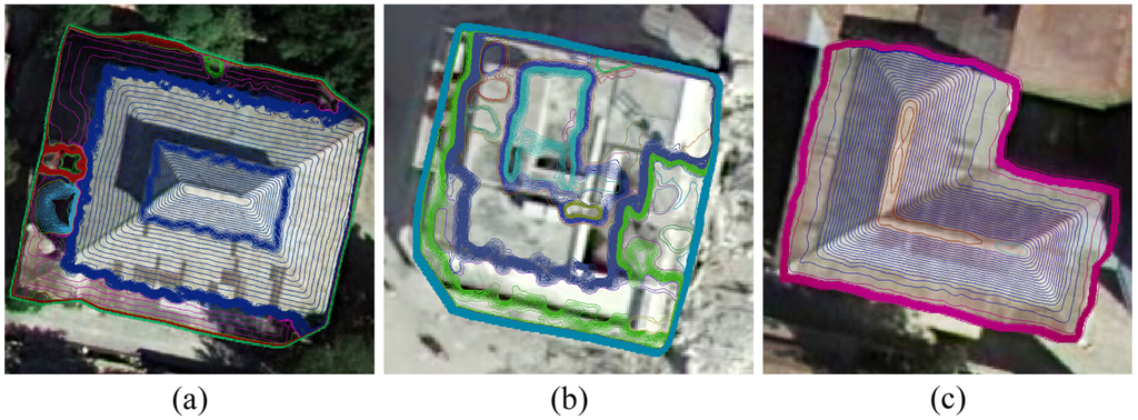 The 3D shape of a roof’s surface and structure can be represented by a contour cluster, which is a set of contours extracted from a contour tree based on a containment relationship. A contour tree is a data structure addressing the description of surface topologies and is built upon the containment relationship between contours []. A contour cluster is defined as a subtree in the contour tree according to the following three conditions: (1) the subtree’s root node has no parent node or has a brother node in the contour tree; (2) the subtree’s terminal node has no child node or has at least two child nodes in the contour tree; and (3) the subtree’s other node has only one child node in the contour tree. The building’s surface regions belonging to the same structure are segmented from the complex building surface by the contour cluster based on a homogeneous spatial topology relationship, and each region is represented by a set of contours in the contour cluster, as shown in Figure 4.