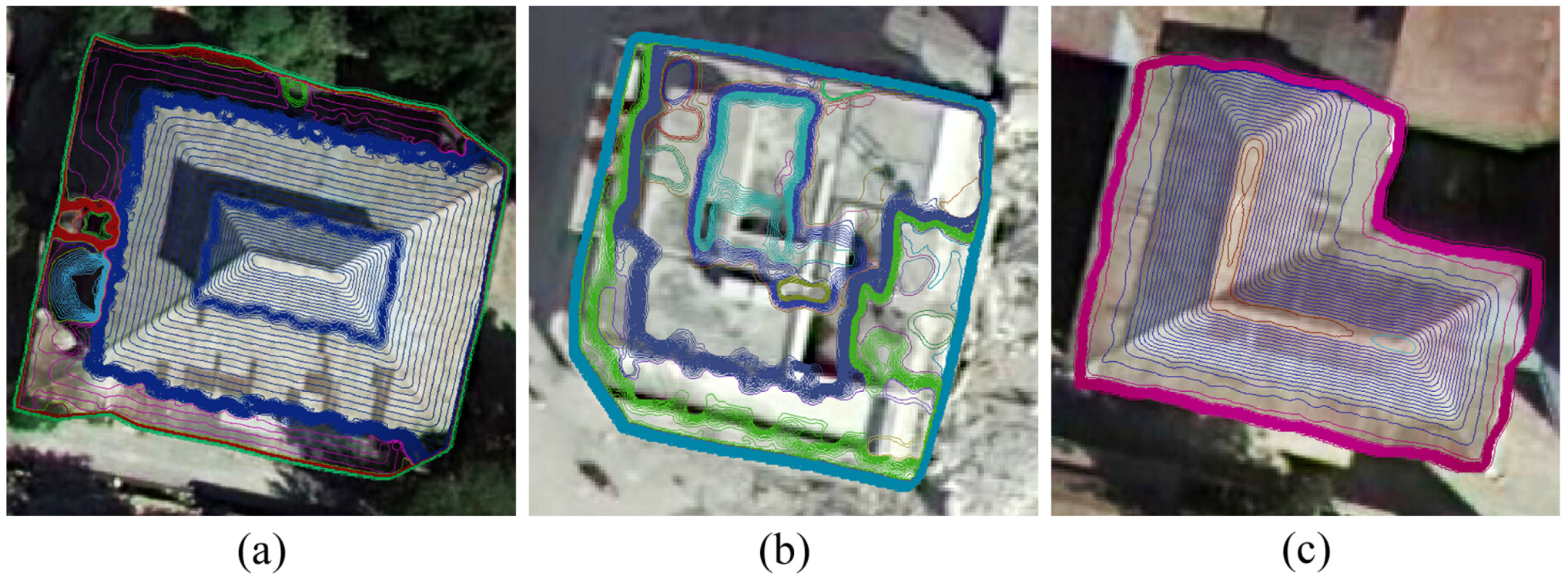 Contour clusters of typical buildings that are difficult to identify using the proposed 3D shape descriptor: (a) Partially damaged roof with gaps; (b) Intact roof exhibiting complex features; (c) Intact L-shaped roof.