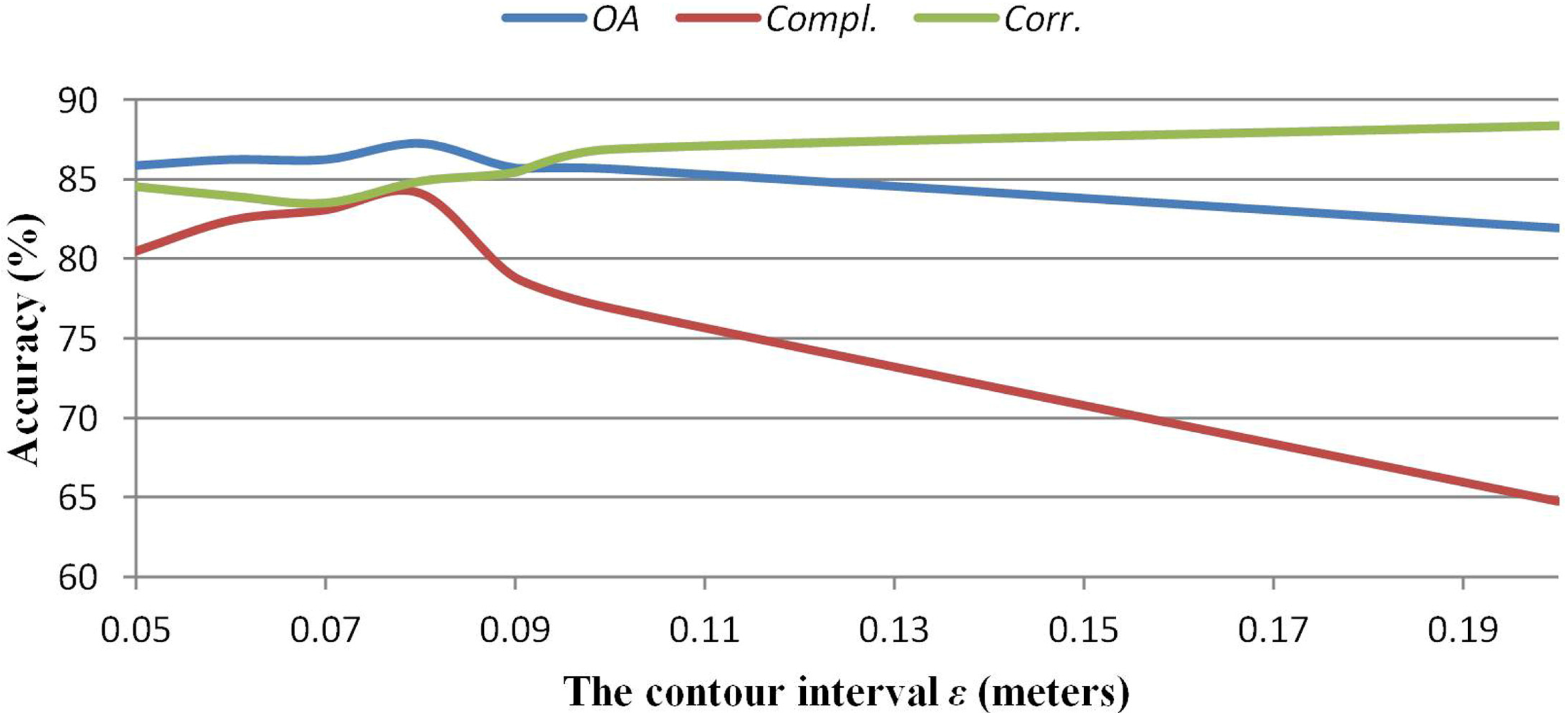where ε is the contour interval, θ is the average roof slope, and g is the grid cell size of the DSM. According to general building structure knowledge, the average slope is usually less than 45°; therefore, the optimal contour interval should be no more than the grid cell size of the DSM. To select the key parameters ε and ω, a sensitivity analysis is conducted using the variations in each parameter in a reasonable range while the other parameter is fixed at the value that leads to an optimum accuracy. The overall accuracy (OA), completeness (Compl.) rate and correctness (Corr.) rate are used to evaluate ε and ω.
