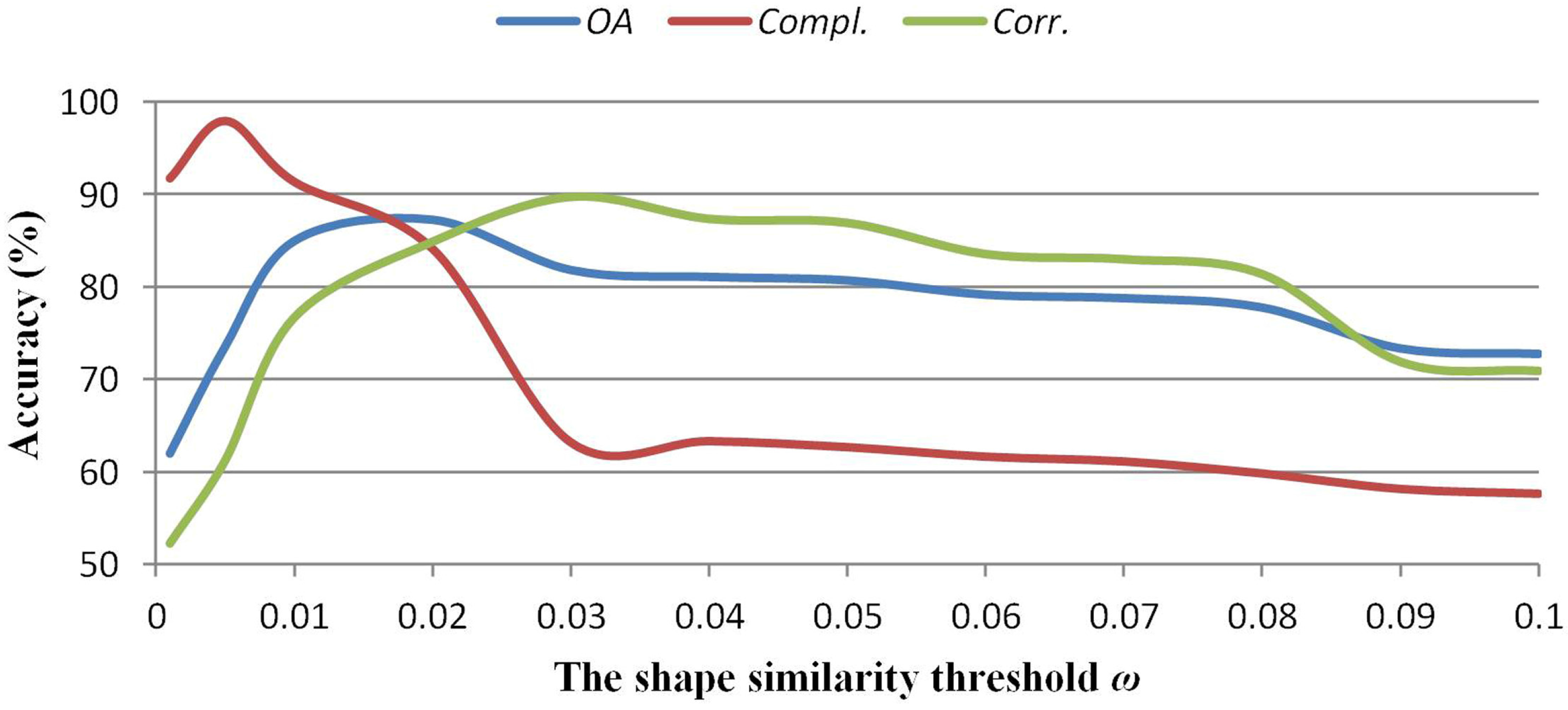 The quantitative analysis results for the two parameters are shown in Figure 13 and Figure 14, which compare several reasonable values of ε and ω. As the parameter ε increases, the overall accuracy (OA) and the completeness (Compl.) rate increase at first and then decrease; the correctness (Corr.) rate follows the opposite trend. When the parameter ε is 0.08 m, which is less than the DSM’s grid cell size of 0.1 m, the OA reaches the local maximum. The result verifies that a relatively reliable result can be achieved when the contour interval is no more than the grid cell size of the DSM. The exact roof slope estimated based on the point cloud can be used to select an ideal contour interval for each building. The OA, Compl. and Corr. also increase at first and then decrease as the parameter ω increases. When the parameter ω is 0.02, the OA reaches a local maximum. It is difficult to quantitatively analyze the parameter ω because it is affected by many factors such as the roof structure, the quality of the contours and the characteristics of the shape similarity measurement based on the normalized FDs. The sample training of contour clusters represents a good option toward selecting a proper parameter ω. Based on the experiments, the values of ε and ω are set as 0.08 m and 0.02, which produce the optimum accuracy in damaged roof detection, as shown in Table 2.