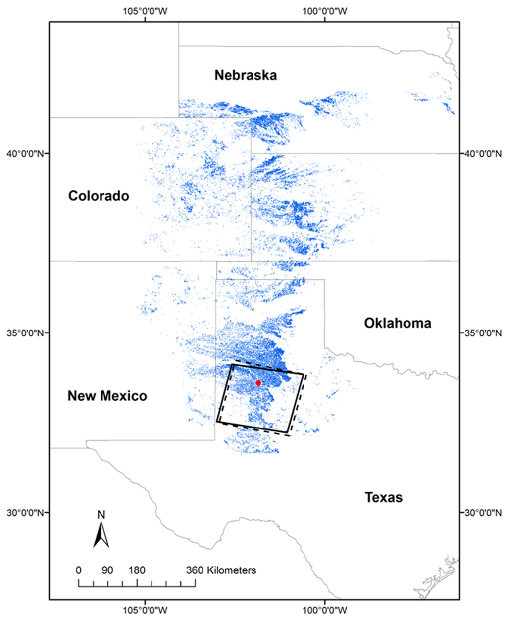 The occurrence of playas (blue) in the U.S. and our focal area (Landsat scene 30/37), showing the difference in coverage between satellites/dates (Landsat 5 TM: solid outline; Landsat 8 OLI: dashed outline) in Texas. Playa locations are from the Playa Lakes Joint Venture [54] to show the full extent of playas in the U.S., which extends beyond the boundary of the Playa Wetlands Database (Texas, Oklahoma, New Mexico) used in our project. The location of Lubbock (largest populated place within scene 30/37) is shown as the red dot.