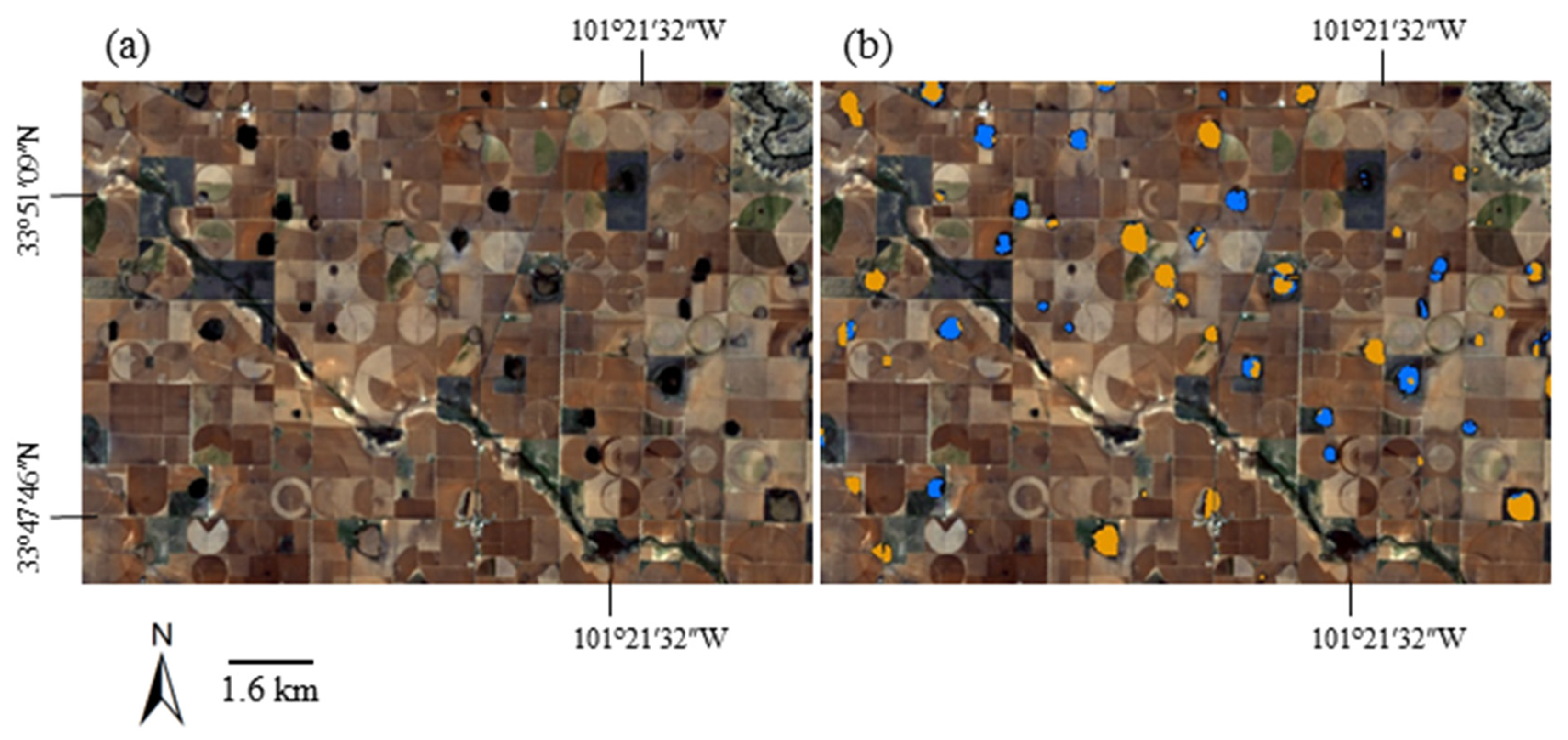 Our study area experiences a rainy season from April through September. Rainfall data were obtained for the National Weather Service’s Forecast Office at the Lubbock International Airport (with Lubbock being the largest populated place within scene 30/37; Figure 1). The area averages 468.1 mm of annual rainfall (long-term average from 1911 to 2013 [52]). By the time the 25 July 1986 image was taken, the area had already received over 5 mm more than its expected average precipitation, primarily from rainfall in the preceding month, which saw nearly double the monthly norm. The 25 July 1986 image we used should thus show a relatively high number of wet playa basins. Beginning in 2011, the region began experiencing “exceptional drought,” with that year recording the lowest annual rainfall since record-keeping began in 1911 [53]. Beginning in January 2011 until 21 May 2014, the area received only 774.7 mm of precipitation, about half of the 1506.9 mm long-term average expected for that span. During this worst drought on record, most playas in the region were dry until rains began on 21 May 2014. Thus, our 3 May 2014 image should have very few wet playas present. Between 21 May and 3 June 2014, 132.8 mm of rain fell (on just 6 days within that 14-day span), representing over 28% of the 468.1 mm annual average. This amount of rain filled many playas in the region, some for the first time in at least four years. Thus, our 4 June 2014 image should have a relatively large number of wet playas present. Between 4 June 2014 and 25 July 2015, there was 977.1 mm of precipitation, well above the 604.5 mm long-term average. Thus, our 25 July 2015 image should also show a relatively large number of wet playas.