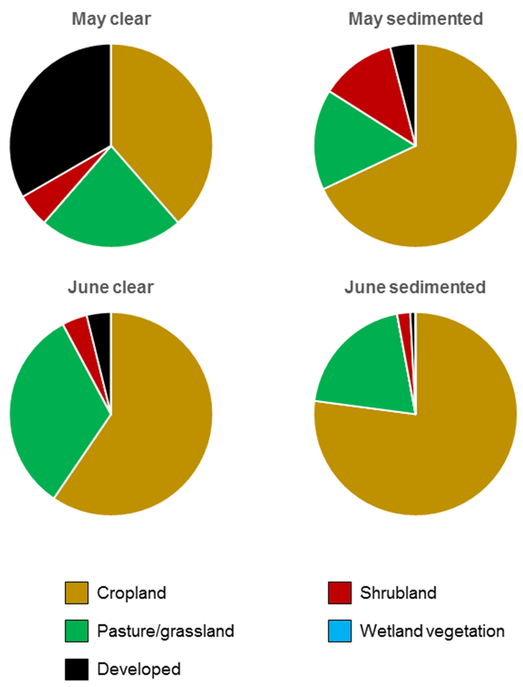 Pie charts of the proportions of the dominant land use surrounding playas classified as clear (left) or sedimented (right) in May (top) and June (bottom) 2014. The wetland vegetation land-use category was the dominant land-use type for only a single playa (one classified as turbid, 4 June 2014) and so is not readily apparent in the figure. The other land-use categories (barren, forest, and open water) were not the dominant land-use type for any playa and so are not depicted in the legend.