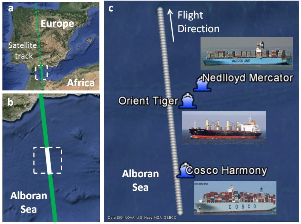 (a) Study area: the Alboran Sea between Europe and Africa in the Western Mediterranean Sea; (b) analyzed CryoSat-2 northward track segment; and (c) a zoom-in of the track segment with the position of the three ships used for the analysis.