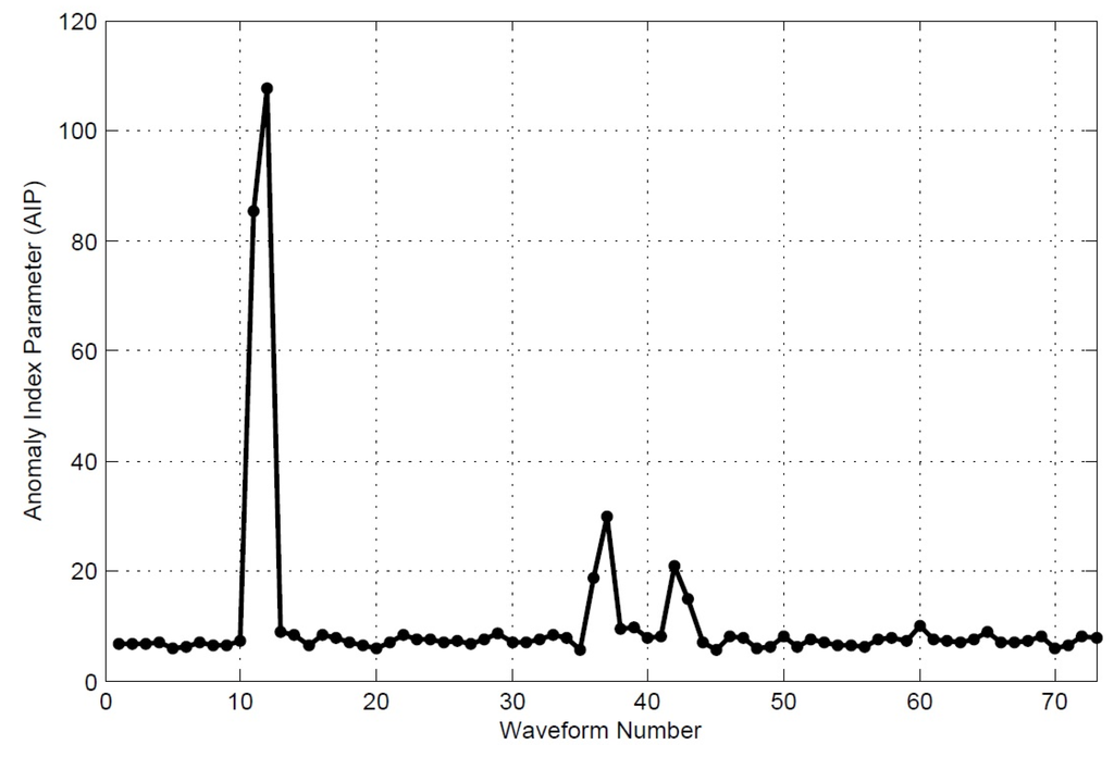 In this context, it is important to define a consistent and repeatable method for identifying anomalous signals, after the merely visual individuation performed in the representation domain, as shown in Figure 2. Thus, we introduce a metric to assess the degree of anomaly of each acquired waveform, in terms of its distance from a reference one. Each waveform (in its vectorial representation) consists of 512 range bins, where each bin corresponds to a single component of the vector space, and can be associated with a scalar quantity that we designate the Anomaly Index Parameter (AIP):