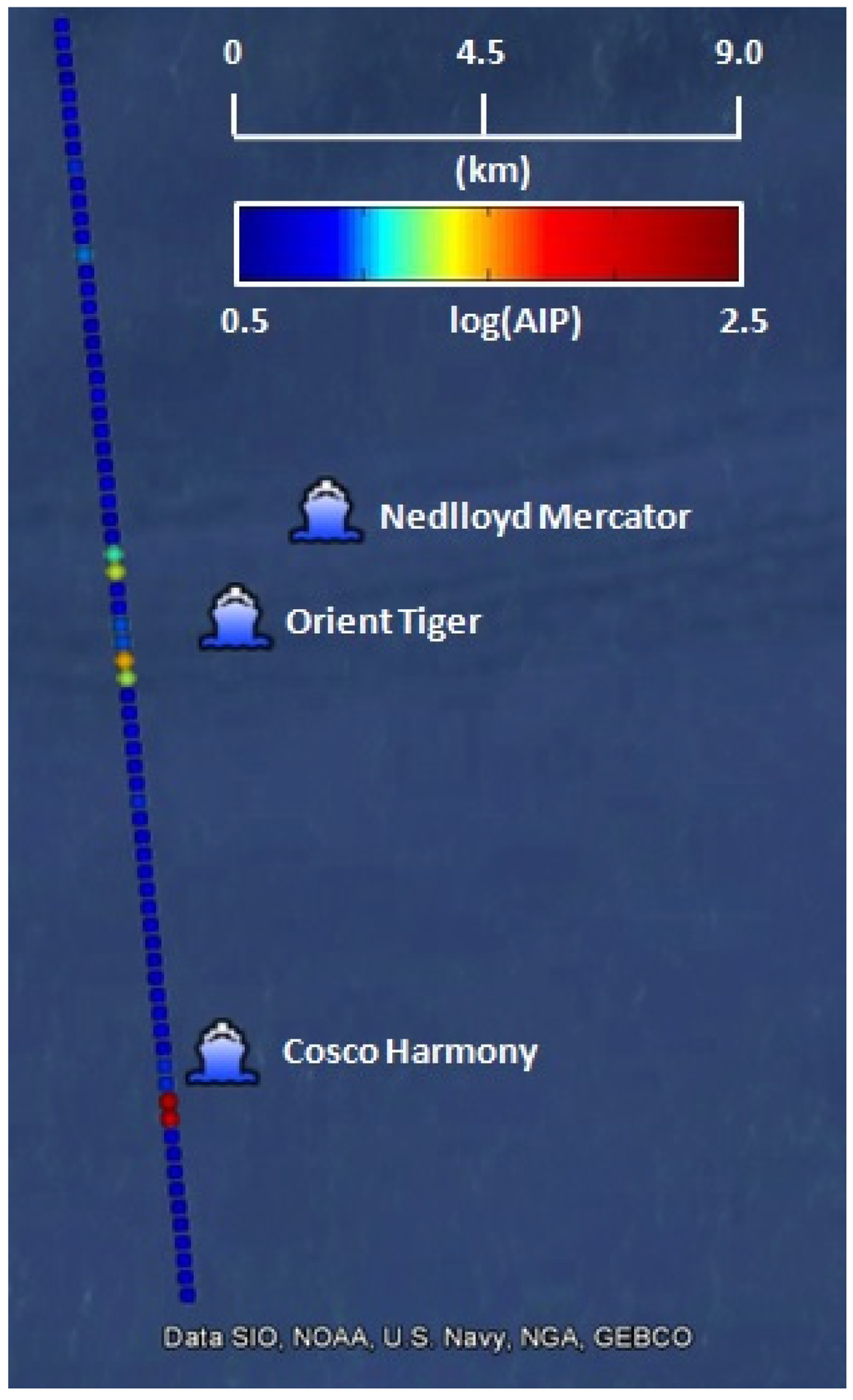 Projection of the AIP (in a logarithmic scale) onto the satellite track. The position of the ships is also shown.