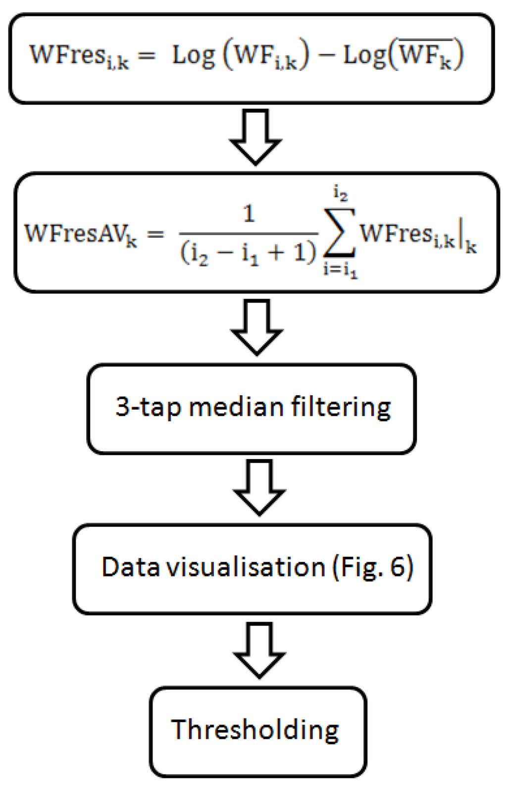 Flow diagram summarizing the procedure for identifying the gates corresponding to non-ocean scatterers. WFresi,k stands for the “waveform residuals” being calculated as the distance between each waveform and their reference (in Log scale). WFresAVk stands for the average of adjacent waveforms identified as “anomalous”. Indices i1 and i2 indicate, respectively, the first and last waveform residual considered.