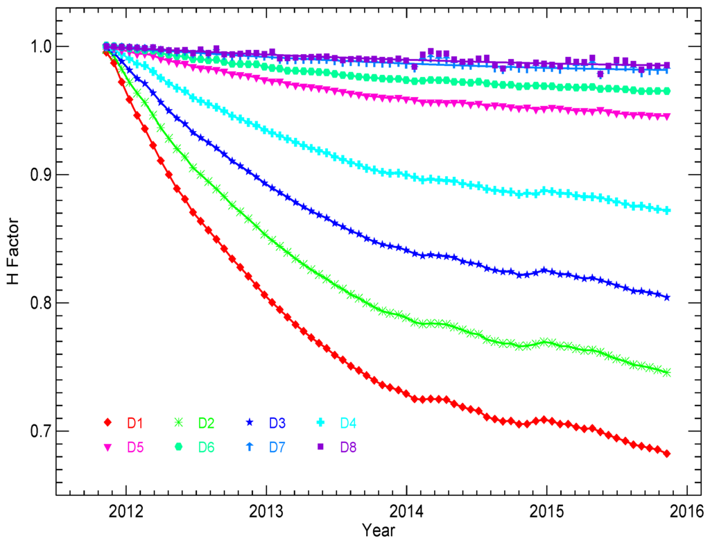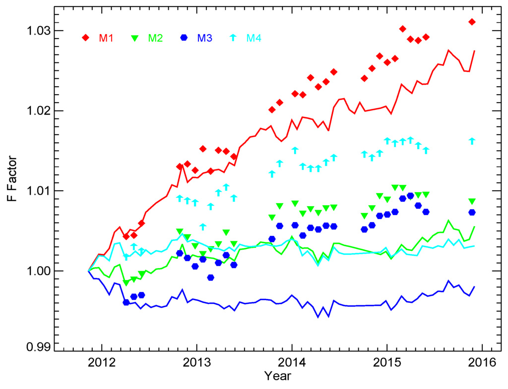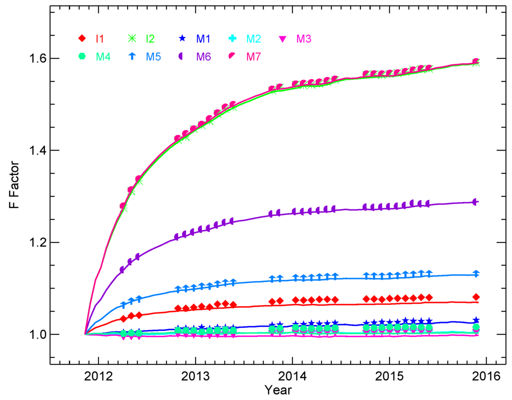 - Lei, N.; Guenther, B.; Wang, Z.; Xiong, X. Modeling SNPP VIIRS reflective solar bands optical throughput degradation and its impacts on the relative spectral response. Proc. SPIE 2013, 8866, 88661H. [Google Scholar]