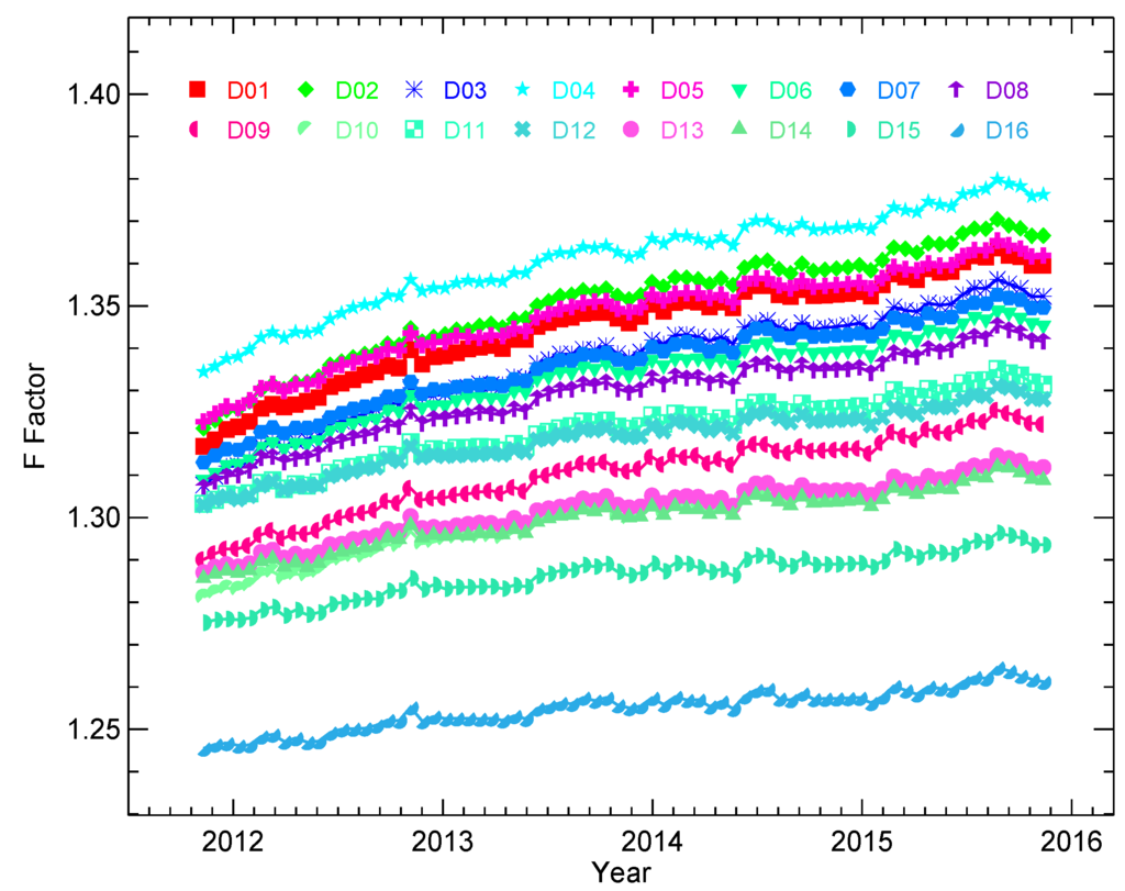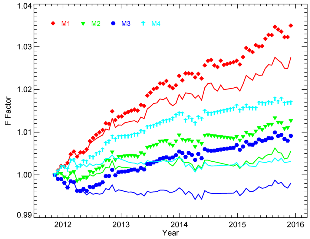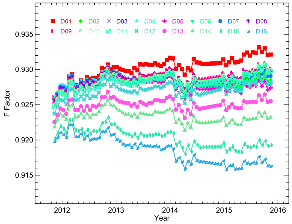 - Sun, J.; Wang, M. VIIRS Reflective Solar Bands On-Orbit Calibration and Performance: A Three-Year Update. Proc. SPIE 2014, 9264, 92640L. [Google Scholar]