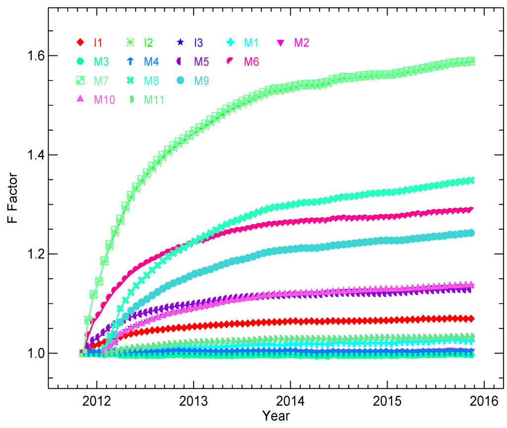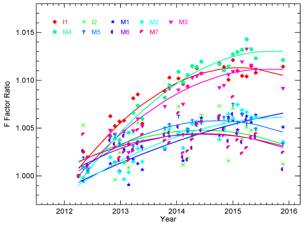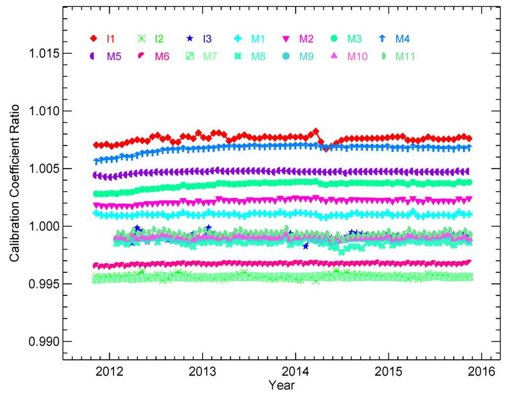 - Cardema, J.C.; Rausch, K.; Lei, N.; Moyer, D.I.; DeLuccia, F. Operational calibration of VIIRS reflective solar band sensor data records. Proc. SPIE 2012, 8510, 851019. [Google Scholar]