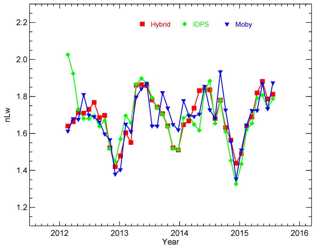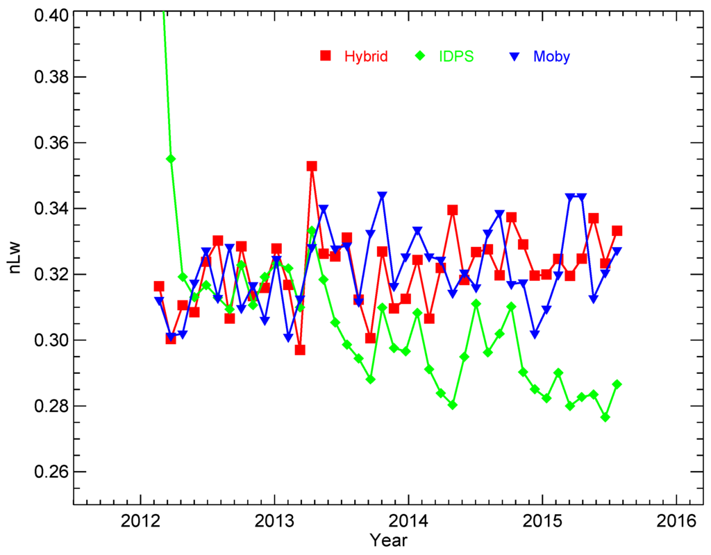 - Wang, M.; Liu, X.; Tan, L.; Jiang, L.; Son, S.; Shi, W.; Rausch, K.; Voss, K. Impact of VIIRS SDR performance on ocean color products. J. Geophys. Res. Atmos. 2013, 118, 10347–10360. [Google Scholar] [CrossRef]