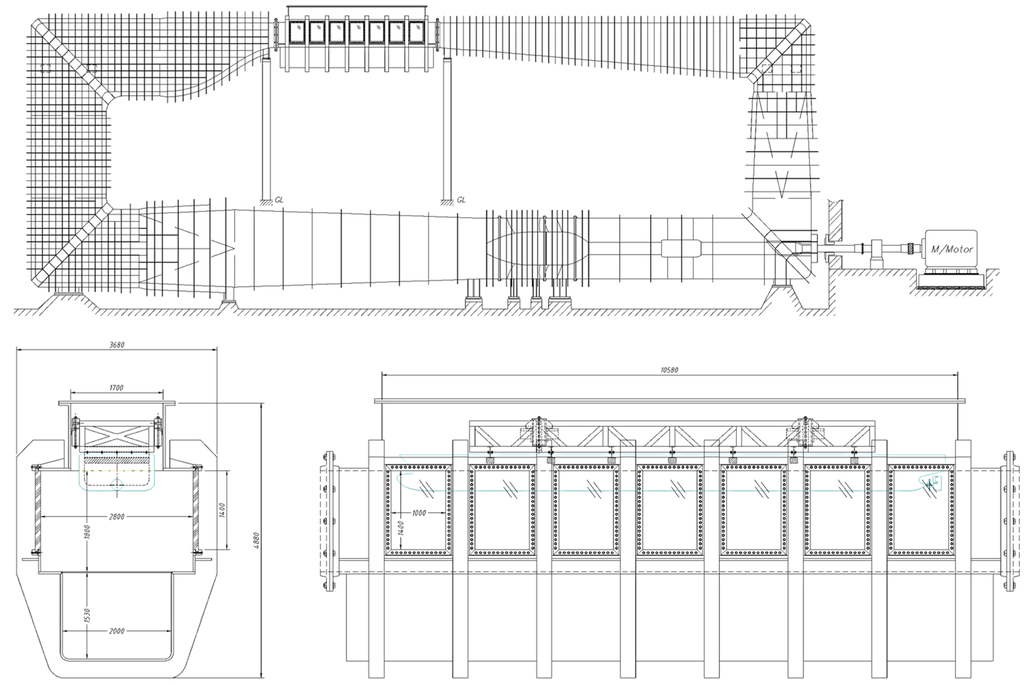 The propeller noise measurement experiments were performed in the KRISO large cavitation tunnel. The objectives of the experiment were to measure and analyze the noise generated by a set of model propellers and model ships. The cavitation tunnel has a rectangular test section, which is 12.5 m (L) × 2.8 m (B) × 1.8 m (H). In the test section, a model ship of a maximum length of 12 m can be installed. The maximum flow speed is 16.5 m/s, and the pressure can be adjusted from 0.02 to 3.5 bar. A schematic diagram of the large cavitation tunnel is shown in Figure 1.