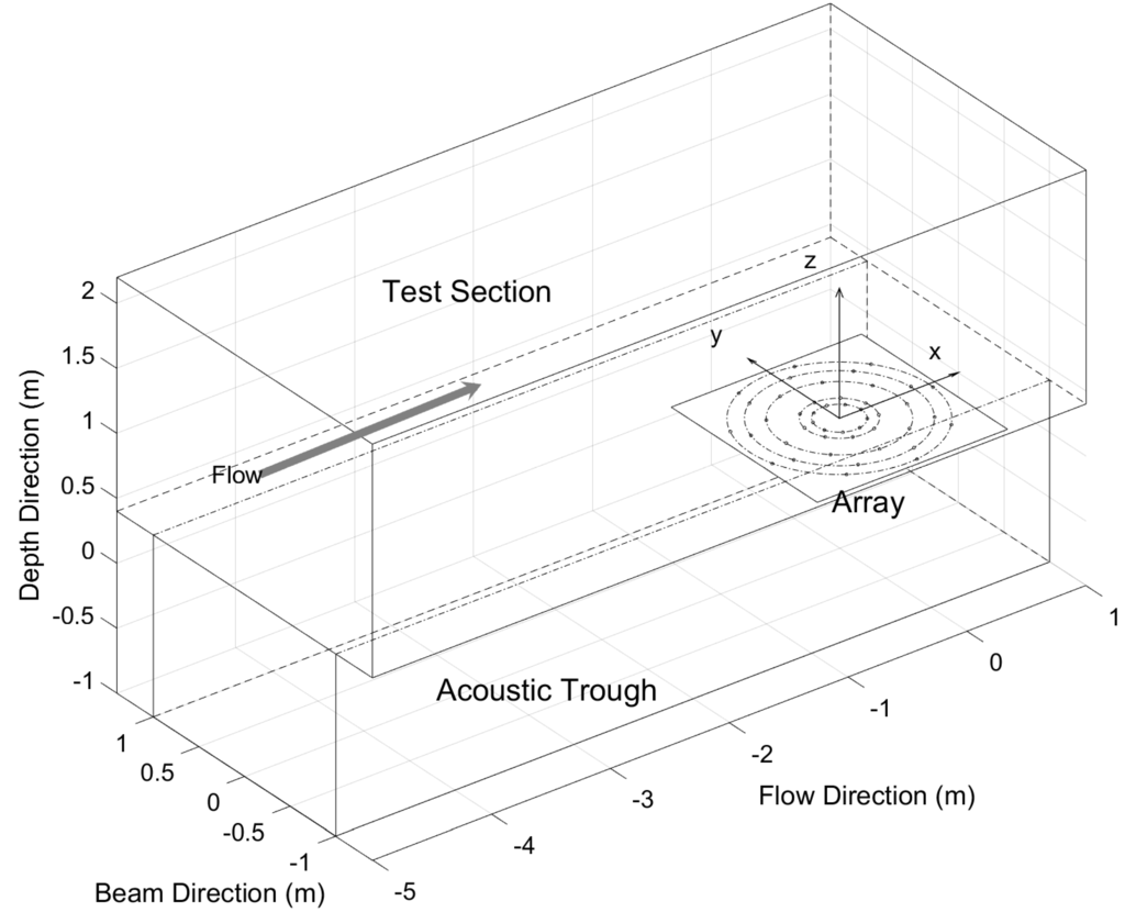 The noise measurements in the cavitation tunnel are performed using single hydrophone or/and a hydrophone array. A single hydrophone measurement is usually utilized when the level of signals, i.e., propeller noise, is larger than the background noise due to its easy implementation. However, it is not applicable when the level of signals is comparable to, or lower than, the background noise. This limitation can be overcome by using the hydrophone array and its array gain. Most large cavitation tunnels where model tests are possible using a model ship with appendages are equipped with the array system [18,19,20]. The hydrophone array is generally installed inside the acoustic trough, which is isolated from the test section by acoustic windows in order to reduce the effect of flow noise.