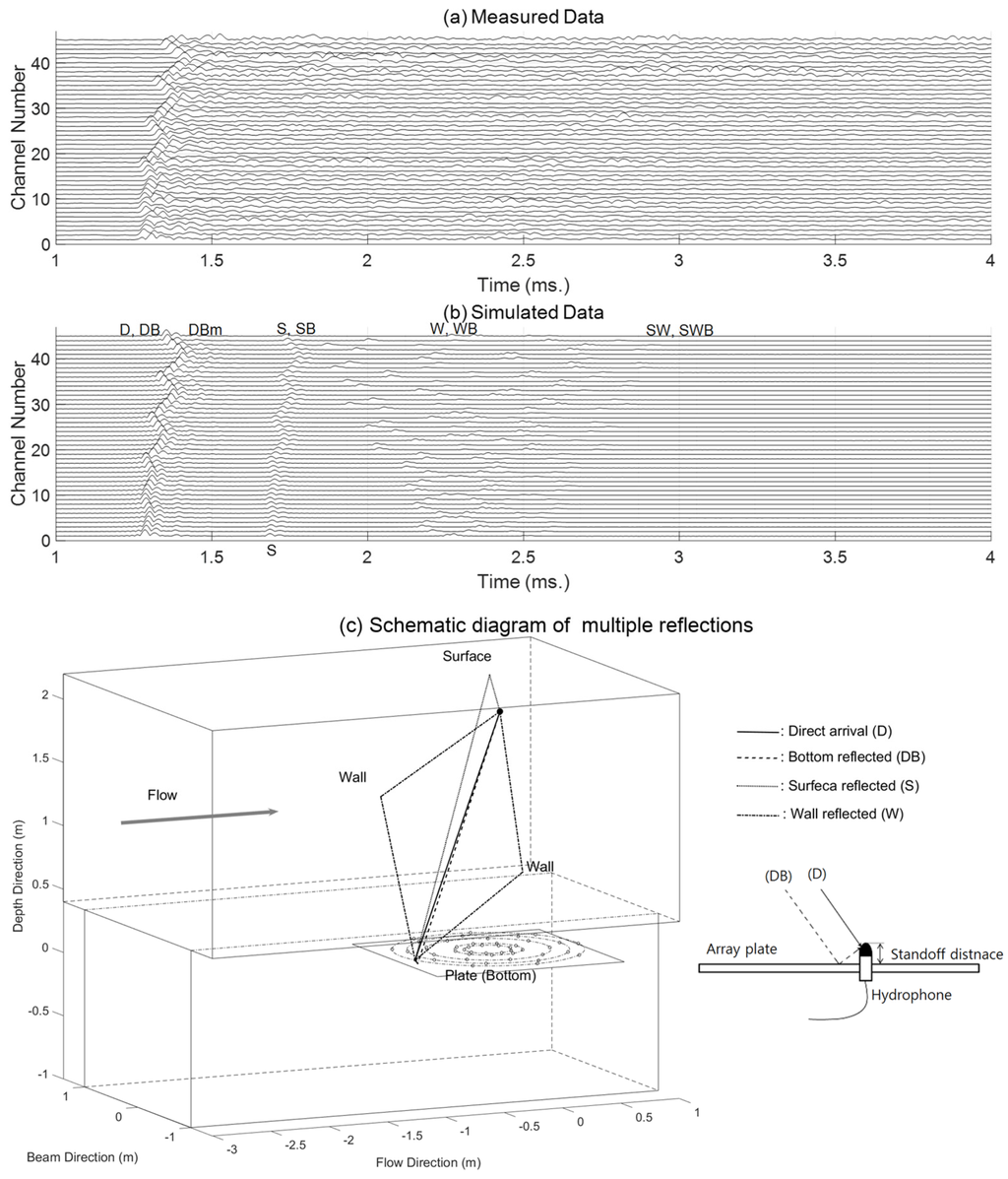 Equation (5) represents multiple arrivals with different amplitudes ) and phases ). Figure 4a shows an example of Green’s functions for the 45 receivers obtained using a virtual source. The virtual source was located at the positions of (0.1 m, 0 m, 1.9 m) relative to the array center, and the frequency range of the input signal was from 1 kHz to 100 kHz. From the figure, multiple reflections along with strong direct arrivals are observed. Figure 4b shows the simulated Green’s function, where such arrivals are included as follows: D, direct arrival; DB, array plate (bottom)-reflected arrival; DBm, multiple reflections between the acoustic window and array plate; S, surface-reflected arrival; SB, surface-bottom-reflected arrival; W, wall-reflected arrival; WB, wall-bottom-reflected arrival; SW, surface-wall-reflected arrival; and SWB, surface-wall-bottom-reflected arrival. Green’s function is calculated using a ray tracing method. The eigenrays representing multiple reflections are shown in Figure 4c. The detail of the bottom-reflected arrival is also given in the figure. The standoff distance in the plot is 15.8 mm for B&K 8103 [33]. Comparing Figure 4a,b, it can be seen that (i) the surface- and wall-reflected arrivals are not distinct in the measured data and (ii) multiple reflections from unknown reflectors exist. Thus, it is very difficult to simulate the transfer function exactly, so we approximate it using only a direct arrival as: