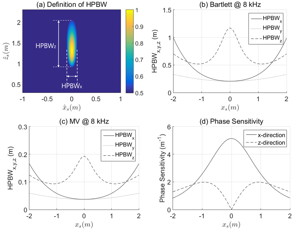 The definition of the half power beam width (HPBW) (a) and HPBWs simulated with respect to the source position at under the condition of 8 kHz and 0 dB SNR for the Bartlett processor (b) and for the minimum variance (MV) processor (c); The color bar in (a) represents the value of . The phase sensitivity simulated under the same condition is shown in (d); The receiver positions are assumed as (−0.1 m, 0 m, 0 m) and (0.1 m, 0 m, 0 m) in the phase sensitivity calculation.