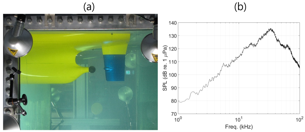 - Chang, N.A.; Ceccio, S.L. The acoustic emissions of cavitation bubbles in stretched vortices. J. Acoust. Soc. Am. 2011, 130, 3209–3219. [Google Scholar] [CrossRef] [PubMed]