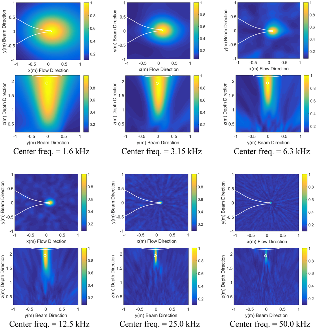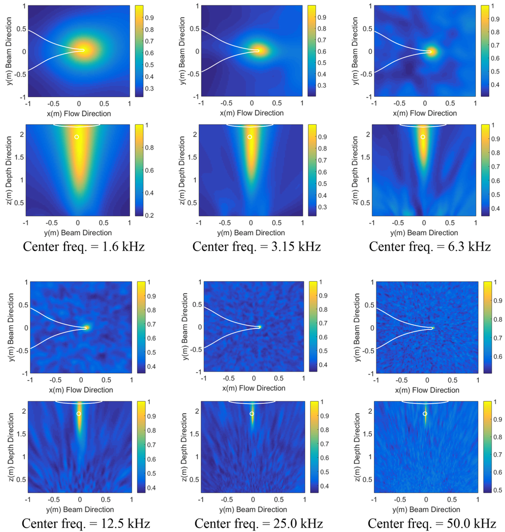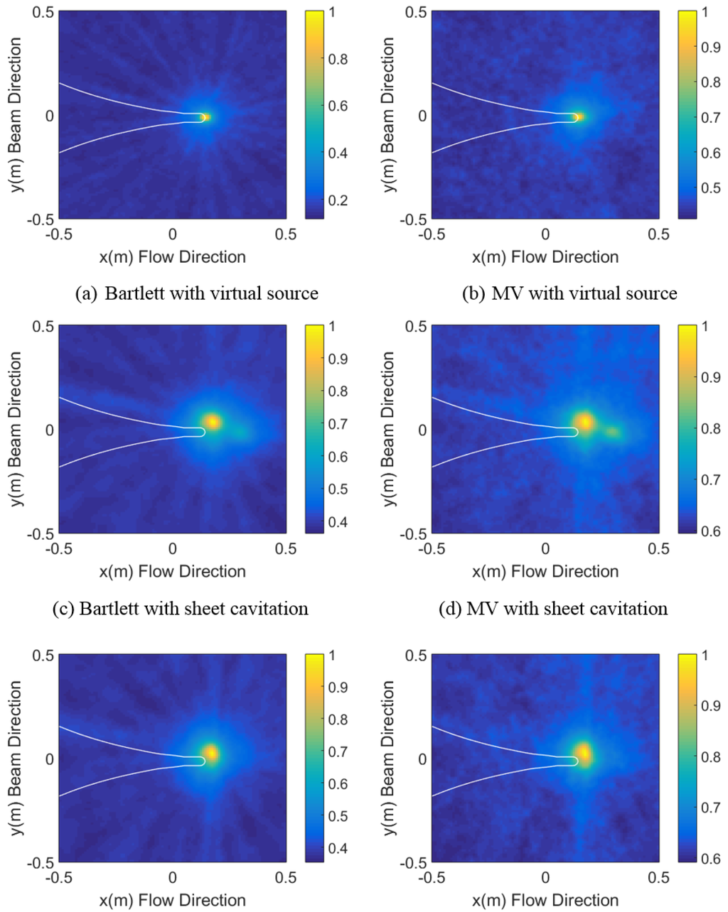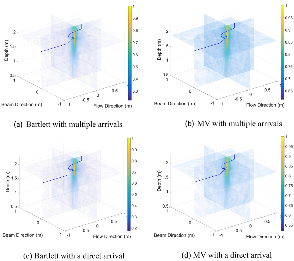 In order to localize noise sources, the Bartlett processor (see Equation (7)), using the replica field of direct arrivals, was applied to a set of data with the frequency range from 5 kHz to 100 kHz, where is 1 kHz. The MV processor powers (see Equation (8)) were also calculated using the same data. The candidate source positions range from −0.5 m to 0.5 m in the flow and beam directions and from 0.5 m to 2.3 m in the depth direction, based on the reference point coinciding with the array center.