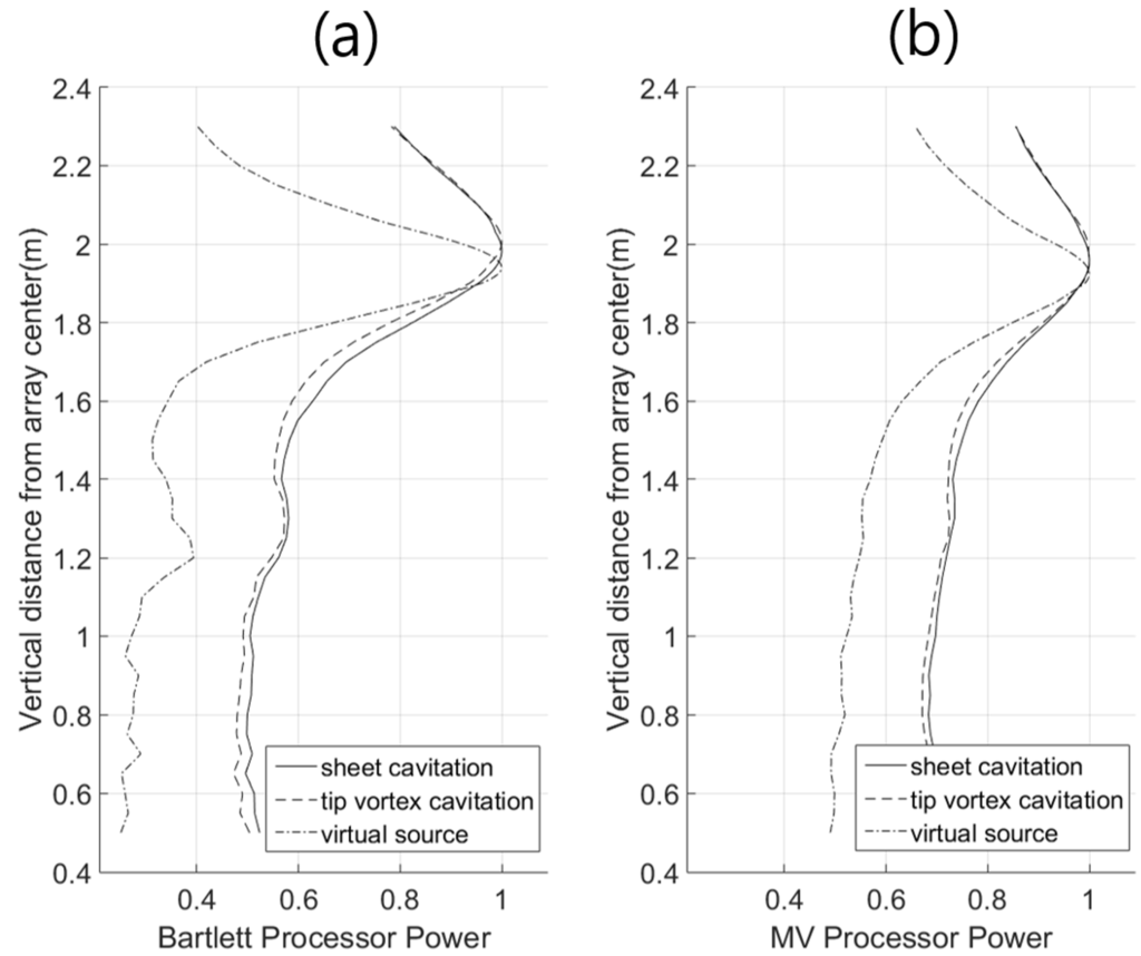 Maximum powers of the Bartlett processor (a) and the MV processor (b) with respect to depth for the virtual source, the sheet cavitation and the tip vortex cavitation.