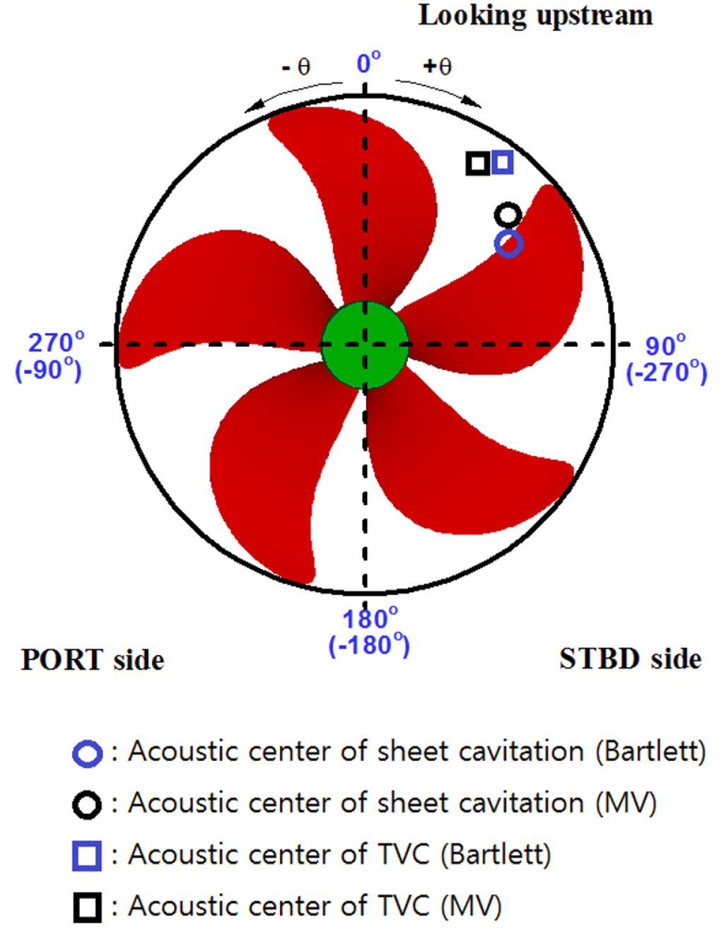 Notation of the blade angular position for the right-handed propeller when looking upstream. The estimated acoustic centers are also shown as circles (O) for the sheet cavitation and as squares (□) for the tip vortex cavitation. (TVC: tip vortex cavitation, STBD: starboard).