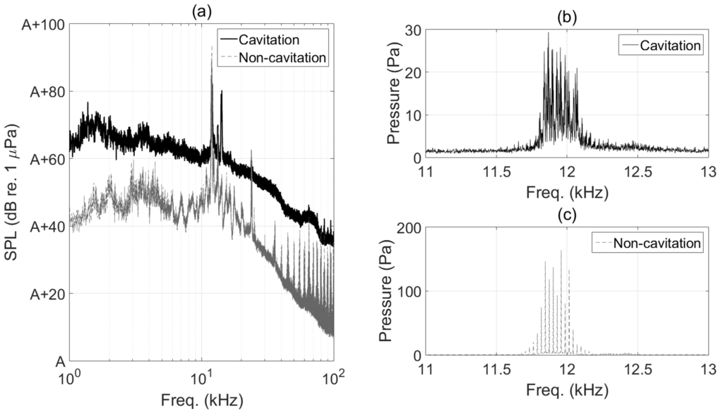 Figure 15a shows the average sound pressure levels of the 45-channel measurements for the cavitation noise and for the non-cavitation noise. The non-cavitation noise refers to the noise that was measured when no cavitation phenomenon was observed on the blade surfaces and around the propellers. In general, the sound pressure level of the non-cavitating propeller is much lower than that of the cavitating propeller. However, opposite results occurred for specific frequencies around 11 kHz. Figure 13c and Figure 15b show the frequency analysis results of both the cavitation noise and the non-cavitation noise, respectively, focusing on the frequency band of interest (11 to 13 kHz). From the figure, a train of high frequency tones is clearly seen for both cases. The difference frequency between two adjacent tones coincides with the propeller rotational speed. Thus, we were suspicious of the “propeller singing” [39].
