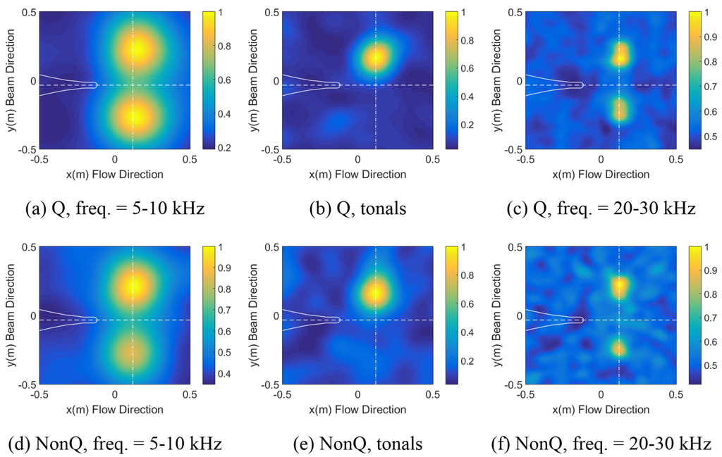 In order to localize noise sources, the Bartlett processor (see Equation (7)) using the replica field of direct arrivals was applied to three sets of data: (i) the 5 to 0-kHz frequency range with of 100 Hz; (ii) tones in Figure 15; and (iii) the 20 to 30-kHz frequency range with of 500 Hz. The datasets are termed “low frequency data”, “tones” and “high frequency data”, respectively. The candidate source positions range from −0.5 m to 0.5 m in the flow and beam directions and from 0.5 m to 2.3 m in the depth direction.