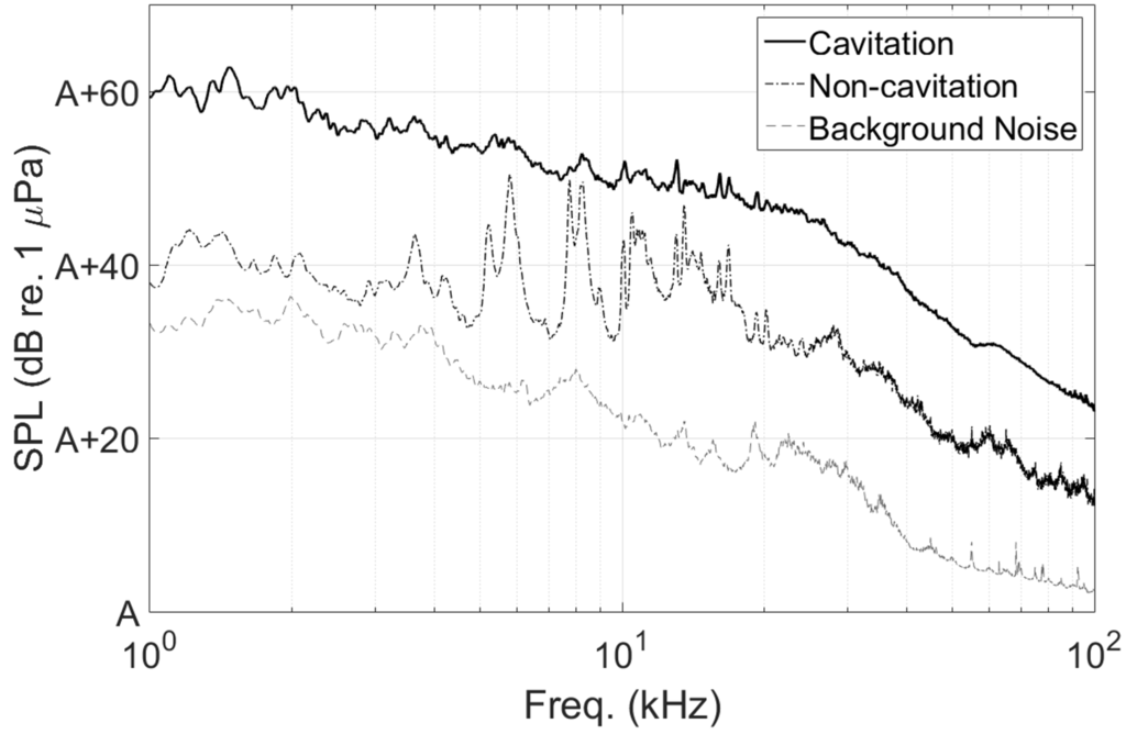 Figure 18 shows the average sound pressure levels of the 45-channel measurements for the cavitation noise, the non-cavitation noise and the background noise. The test condition of background noise was the same as that of cavitation noise. From the figure, it is obvious that the cavitation noise is much louder than the background noise for all frequency ranges.