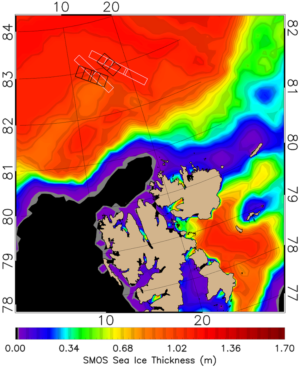 Sea ice thickness on 15 April 2015 according to L3C SMOS data provided by ZMAW, Hamburg). Rectangles indicate the footprint of the acquisitions. The left image cluster was acquired on 19 April 2015 with temporal distance of 94 min, the right image cluster was acquired on 23 April 2015 with temporal distance of 59 min. The slim, long acquisitions are TS-X image (shown in white rectangles), the wider shorter ones are RS-2 images (shown in black rectangles).