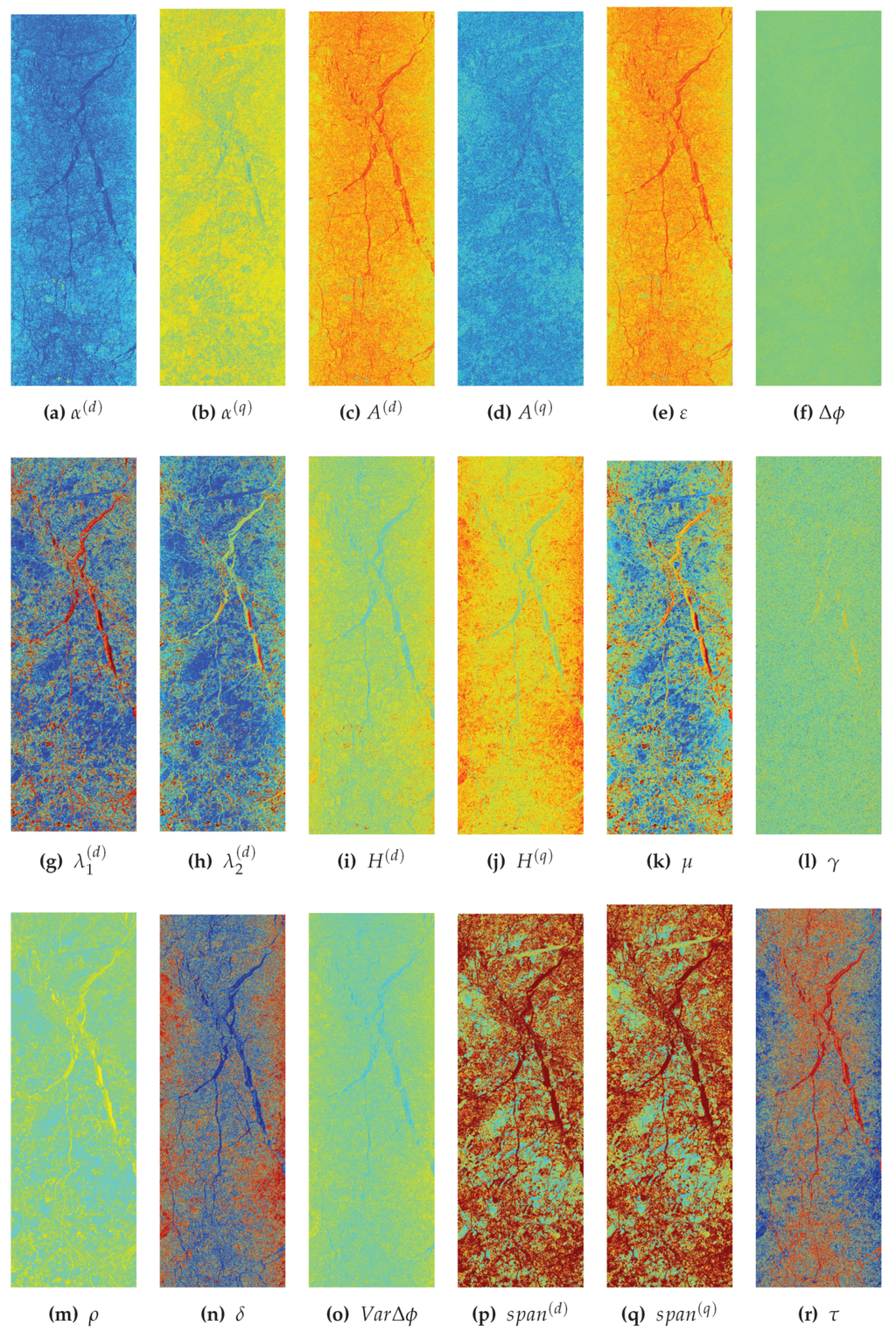 Images of different features for TS-X 23 April 2015, frame 1: (a) ; (b) ; (c) ; (d) ; (e) ε; (f) ; (g) ; (h) ; (i) ; (j) ; (k) μ; (l) γ;, (m) ρ; (n) δ; (o) ; (p) ; (q) ; (r) τ.