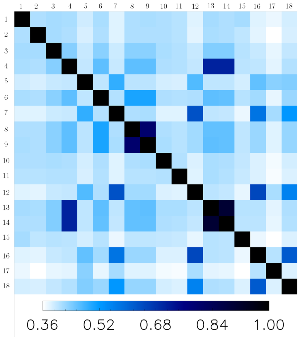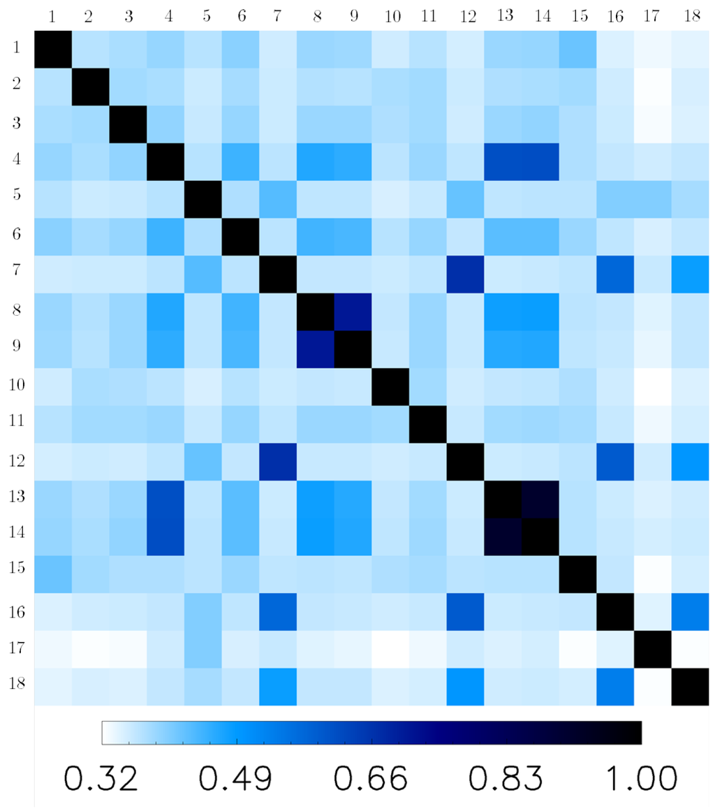 Normalized mutual information for TS-X image of 23 April 2015, . Features are: 1: γ, 2: , 3: ρ, 4: ε, 5: μ , 6: τ , 7: , 8: δ, 9: , 10: , 11: , 12: , 13: , 14: , 15: , 16: , 17: , 18: .