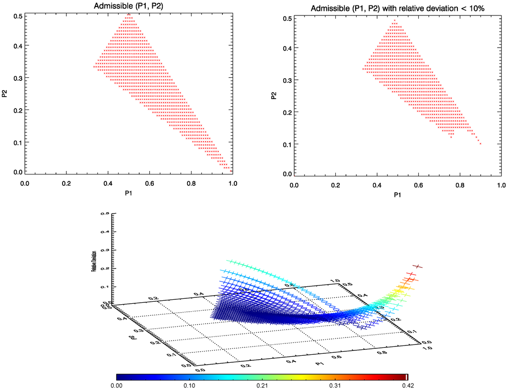 (Top Left) Plot of the domain of admissible pairs. (Top Right) plot of pairs , where the relative deviation . (Bottom): relative deviation .
