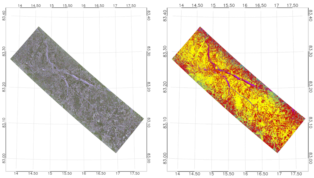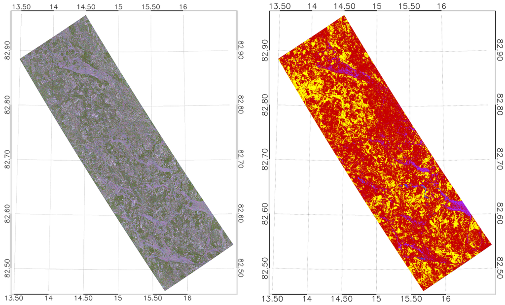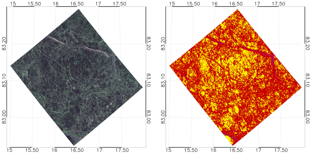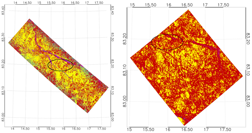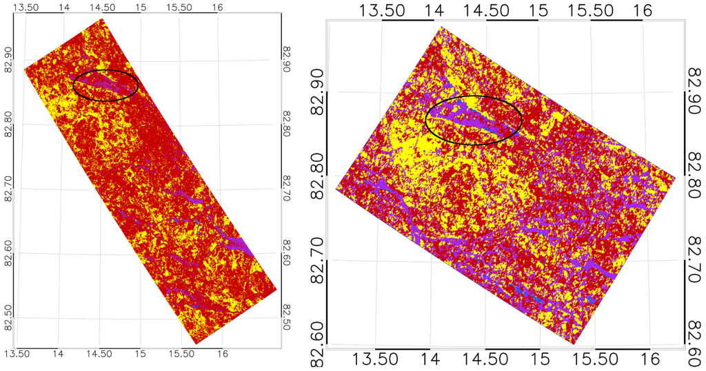 In Figure 1, one can see that only some of the frames for each acquisition day overlap. To ease the orientation when directly comparing the outcome of the classification results for the same ice structures, we included some examples in Figure 9 and Figure 10 with highlighted matching ice floe structures. Due to a lack of actual ground truth, we do not discuss in this juxtaposition which sensor offers the more plausible result. However, we do observe that for 19 April 2015 the TS-X image overstates the occurrence of RFYMYI at the expense of YI and SFYI, relative to the RS-2 classification (Figure 10). This behavior of the sensors appears to be reversed for the image of 23 April 2015 (Figure 9). We also note that the water portions that appear in the highlighted part of the (mid incidence angle range) RS-2 figure of 19 April 2015 (Figure 10) are practically absent in the (far range) TS-X image. The reversed behavior we observe in Figure 9, where the near range image (TS-X) shows detections of open water in the highlighted area whereas in the far range image there are no such detections. We also notice in the TS-X image of 23 April 2015 that RFYMYI (and also OW) tends to be overstated in the classification towards the vertical margins. Such tendencies we do not obersve in the far range TS-X image, nor any of the RS-2 images. So we summarize that for the locations of recognizably identical ice structures (black ellipse area and neighborhood in Figure 9 and Figure 10), we deem it justified to observe significant general match in the classified ice types with a possible incidence angle induced bias for certain ice types. This bias we observe similarly for X-band and C-band. The noticeable noise pattern (especially on the vertical margins) of the TS-X near range image of 23 April 2015 suggests the preferred use higher incidence angle acquisitions (i.e., above ). Such incidence angle biases certainly need to be addressed when establishing the classifier. This also stresses the necessity to establish a library of robust classifiers for different incidence angle ranges.