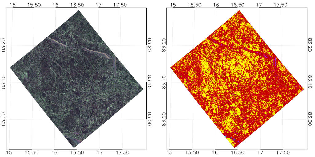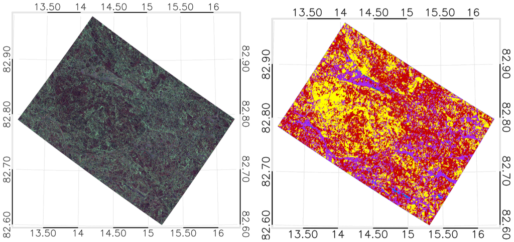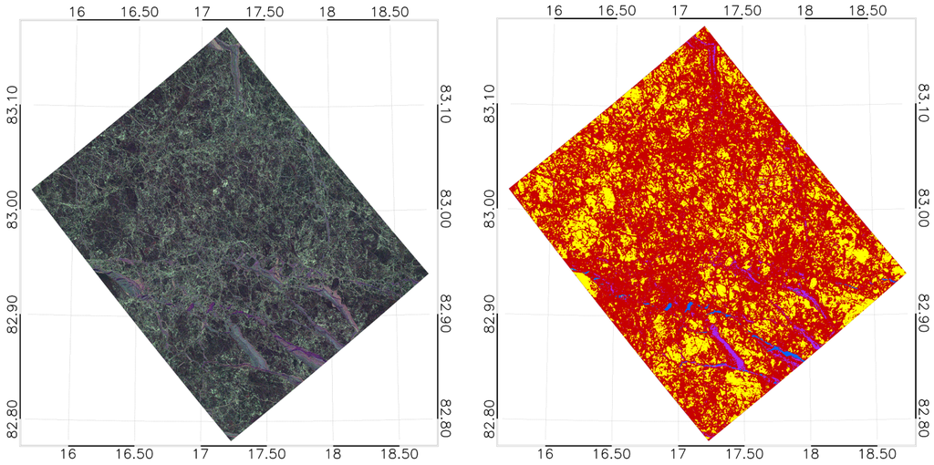 As a filtering of feature matrices, we employed a 5 by 5 pixel median filter to reduce noise effects. Both the C-band and the X-band co-pol power ratio have have been proven to be an excellent measure to distinguish open water and all other ice types, in particular older and thicker ice types ([29], [38], or [52]), given the incidence angle is not too low (according to [38] above 27 for C-band) and low to moderate wind speeds (less than 14m/s in C-band according to [38]). In case of the younger ice types, the co-pol power ratio is not as powerful in discriminating such thin ice from open water. The C-band copolarized phase difference was found to be useful for discriminating certain thinner ice types ([29,46,53]). For L-band, quad-polarimetric entropy is known to discriminate open water from ice types generally well and also thin ice from thick ice types due to the underlying different scattering mechanisms ([40]). (Quad-polarimetric) L-band anisotropy is known to be sensitive to surface roughness ([40]). In the dual-pol case, the classical physical meaning of anisotropy does not hold in general. is nearly equivalent to for purely mathematical reasons (see [55]).
