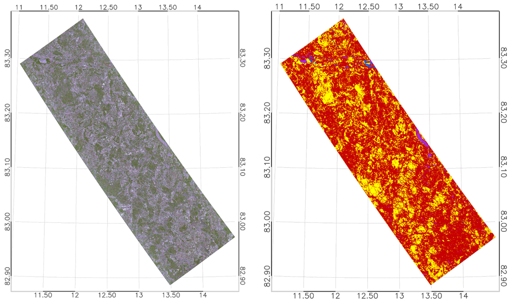 For comparison we also computed from the matrix the angles (defined analogously with eigenvectors of instead of ), simply for the sake of comparison of quad-polarimetric and dual-polarimetric data.The average α angle we defined by