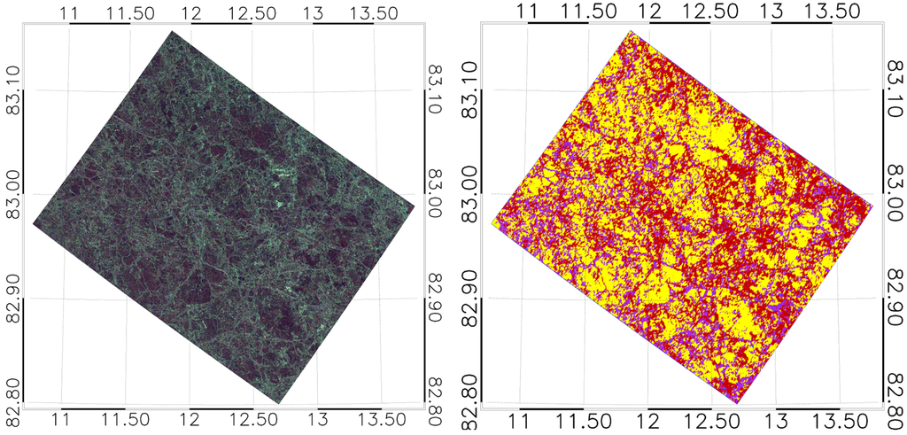 In order to validate the stability of the training process, we randomly split the initial training data patches into two disjoint subsets and generated 10 different classifiers. The classification results compared to reference data samples (as presented in Table 6) exhibit a very promising accuracy (using averaged accuracies over different classifiers), which underscores the stability of our algorithm. The percentages in the matrix indicate the proportion of samples of one reference class that were assigned to the respective ice type by the classifier. Therefore columns add up to 100%. The test was carried out for all four acquisitions with variations of less than 4% in the following accuracy matrix. We therefore only include the results for the TS-X acquisition of 19 April 2015.