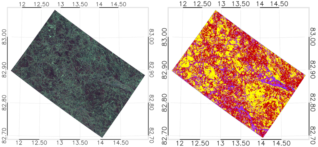 As mentioned in the introduction, we performed a pixelwise supervised classification using a neural network. The feature set we used contained all features plus their respective local variances, which was computed for each center pixel of a 11 × 11 submatrix sliding over the entire feature image. Thus, we extracted for each pixel outlined polarimetric features and then ingested the feature vectors into the classifier. The implementation was carried out in the Exelis IDL programming language (image ingestion, calibration, feature extraction, statistical analysis) and in C (FANN library classifier). The hardware specifications used were: 11 GB RAM, Intel Core i-7 3740 QM, virtual linux OS. The processing time was 20 min in total for feature extraction and classification.
