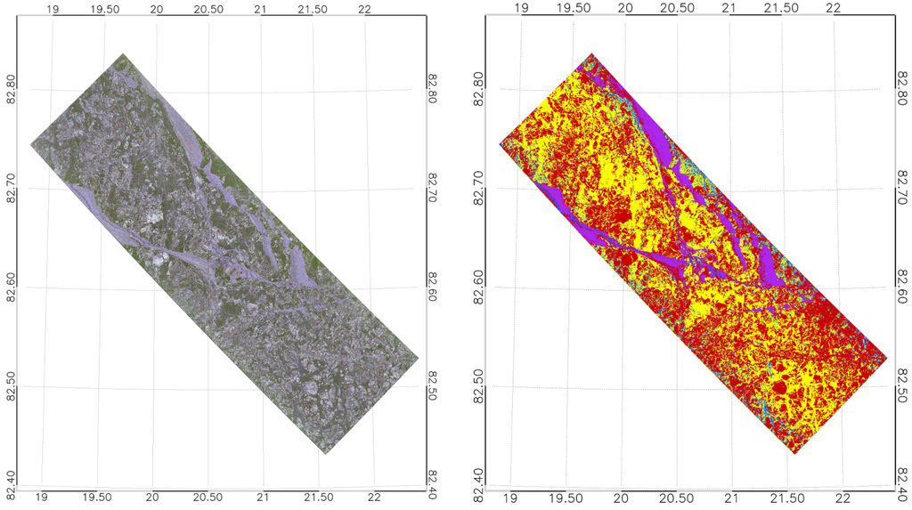 (Left) Geocoded Pauli RGB composite (Red: HH-VV Green: HV+VH Blue: HH+VV) of the TS-X acquisition on 19 April 2015, frame 1; (Right) ice classification. Blue: open water/nilas (OW), purple: young ice (YI), yellow: first year ice (SFYI), red: rough first year ice/multi-year ice (RFYMYI).