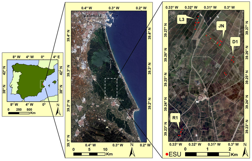 The study area is located in selected farms of the rice district of Sueca (39°16’N, 0°18’W), situated in the south of Valencia, in Eastern Spain (see Figure 1). The area has a typical Mediterranean climate; mild, with an average annual humidity of 65%. The average annual temperature is 17 °C. Their mean values range from 11 °C in January, and 27 °C in August. The mean annual precipitation is approximately 430 mm, tending to be intense and concentrated in autumn.