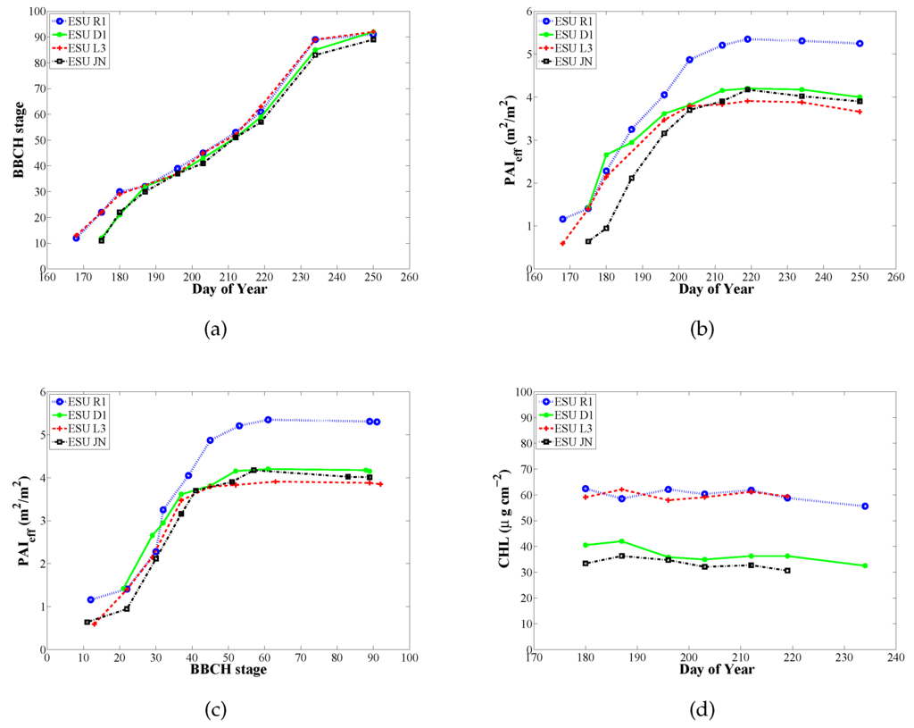 As part of the ERMES field campaign, phenology was monitored during 10 days from DoY = 168 to DoY = 251. In general, all representative ESUs have a similar behavior (see Figure 3a), since sowing dates were very similar in the study area. Comparison of rice PAIeff and BBCH seasonal variation (Figure 3c) highlights three most noticeable features: (1) the fast increase in PAIeff during the tillering and stem elongation vegetative stages (BBCH from 20 to 40); (2) the saturation of PAIeff during the stages of flowering, fruit development, and ripening (BBCH from 50 to 90), in which these vegetative and maturation phases the rice plant loses some leaves and becomes drier, PAIeff being practically constant; and (3) D1, JN, and L3 ESUs have a close evolution, while R1 shows higher PAIeff values due to higher plant density.