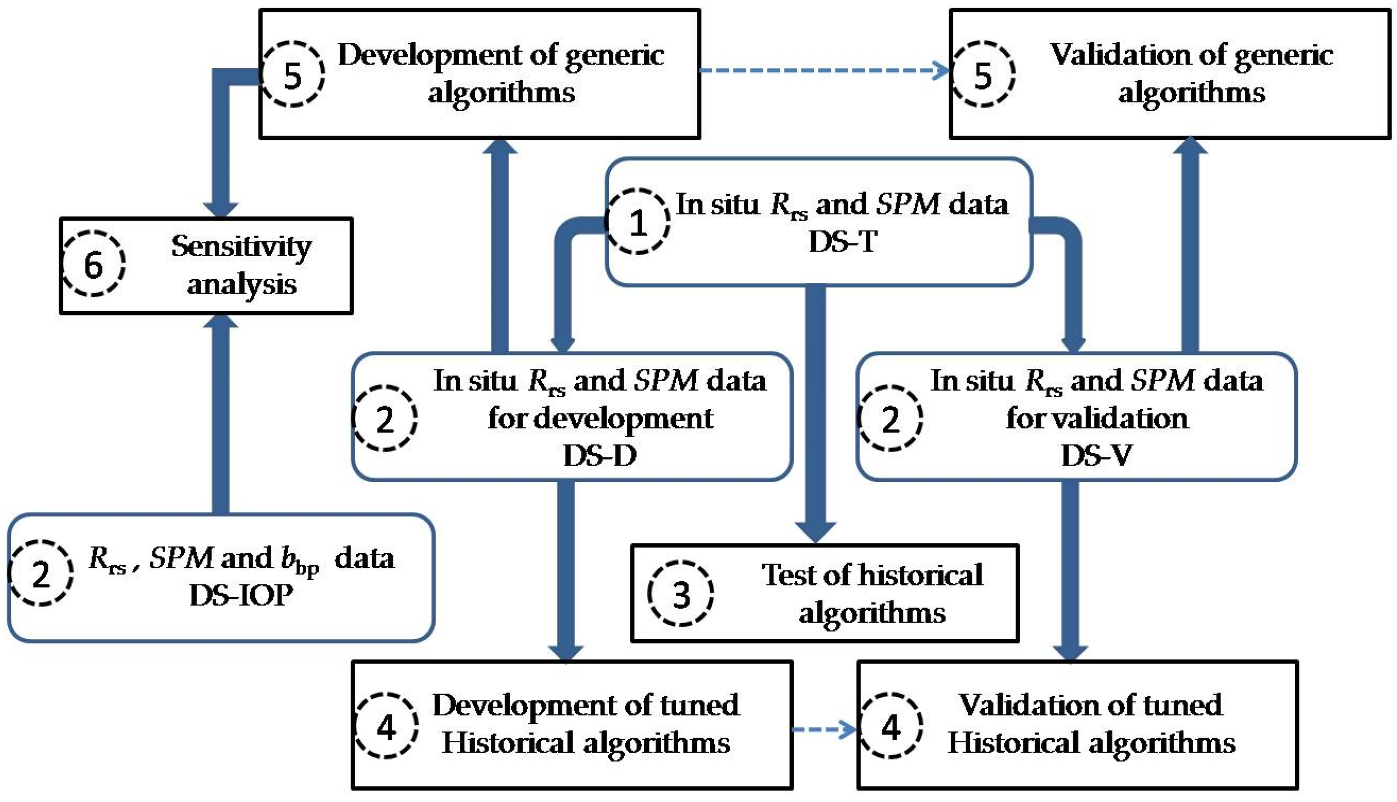 This study was built in this context and aimed at improving the retrieval of SPM concentration for global scale applications in coastal waters (i.e., over large SPM concentration range). For this purpose, an extensive in situ data set (N = 631) of coincident bio-optical (Rrs and IOPs) and SPM measurements was built gathering measurements collected within five contrasted coastal sites (European coastal waters, French Guyana, Eastern Vietnam sea, China Yellow sea, and North Canada). Based on this data set covering more than four orders of magnitude in SPM concentration, the first objective is to precisely assess the potential limitations of existing historical empirical and semi-analytical models. Considering that an exhaustive comparison of the available SPM inversion models is not achievable in practice, four models initially developed based on contrasting hypotheses are considered: two empirical formulations [20,24] and two semi-analytical models [26,29]. In a second step, generalized formulations for retrieving SPM concentrations over this wide range of turbidity and for a variety of ocean color (i.e., SeaWiFS, MODIS-A/T, MERIS/OLCI, VIIRS) and high resolution (LandSat 8-OLI, and Sentinel 2-MSI) sensors are proposed. Finally, a sensitivity analysis aiming to identify the source of error in SPM retrieval is specifically investigated from the present extended in situ data set for the different models proposed. The impact of the natural variability in particulate matter IOPs, the uncertainties in the satellite reflectance signal, and also the impact of sensors specific spectral response are specifically investigated from this extended in situ data set. These different steps are summarized in Figure 1.