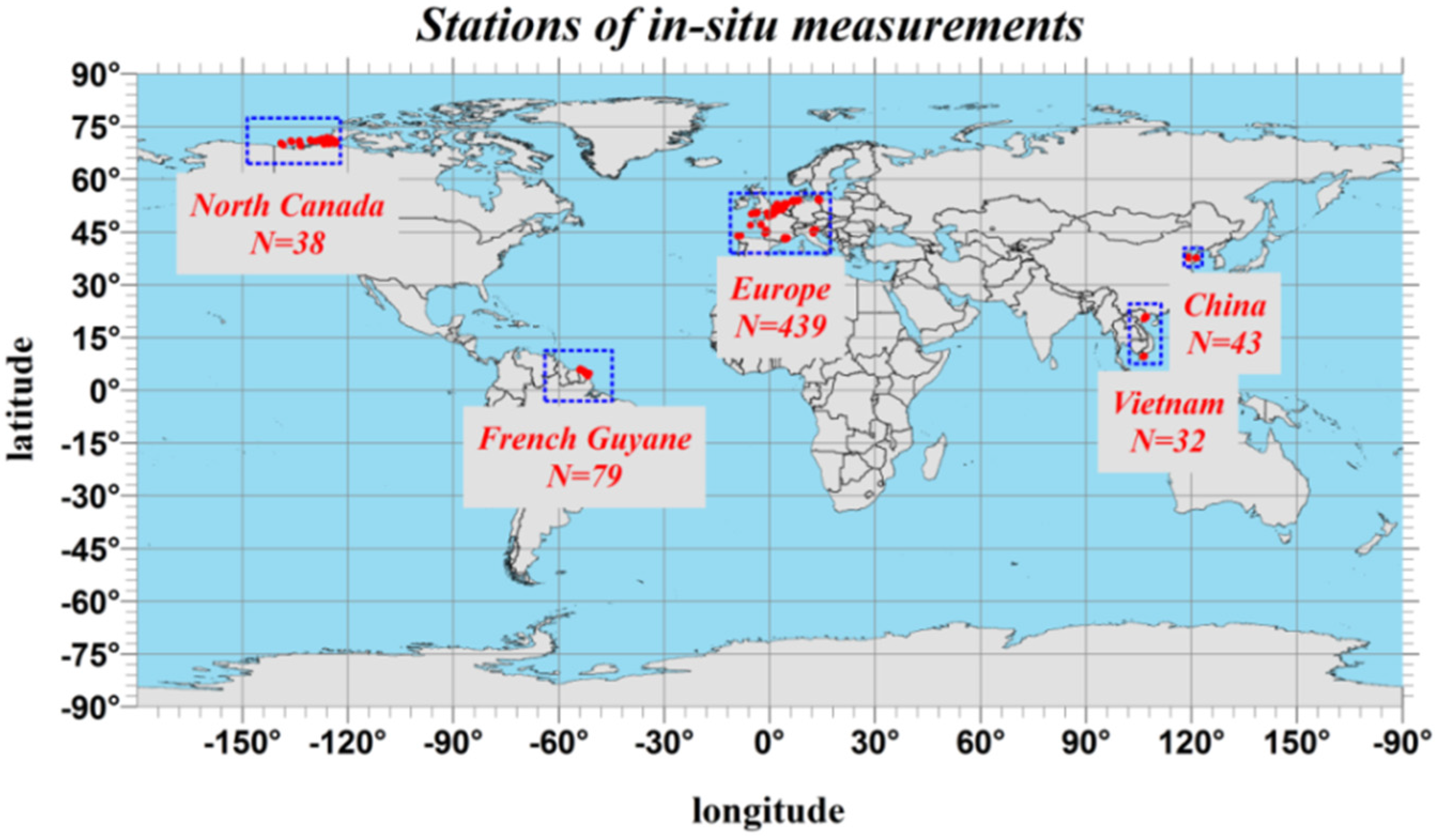 The present data set gathers in situ measurements of SPM and Rrs(λ) collected in various coastal regions (European coastal waters, French Guiana, Eastern Vietnam sea, China Yellow sea, and North Canada) within the framework of different oceanographic field surveys (Figure 2).