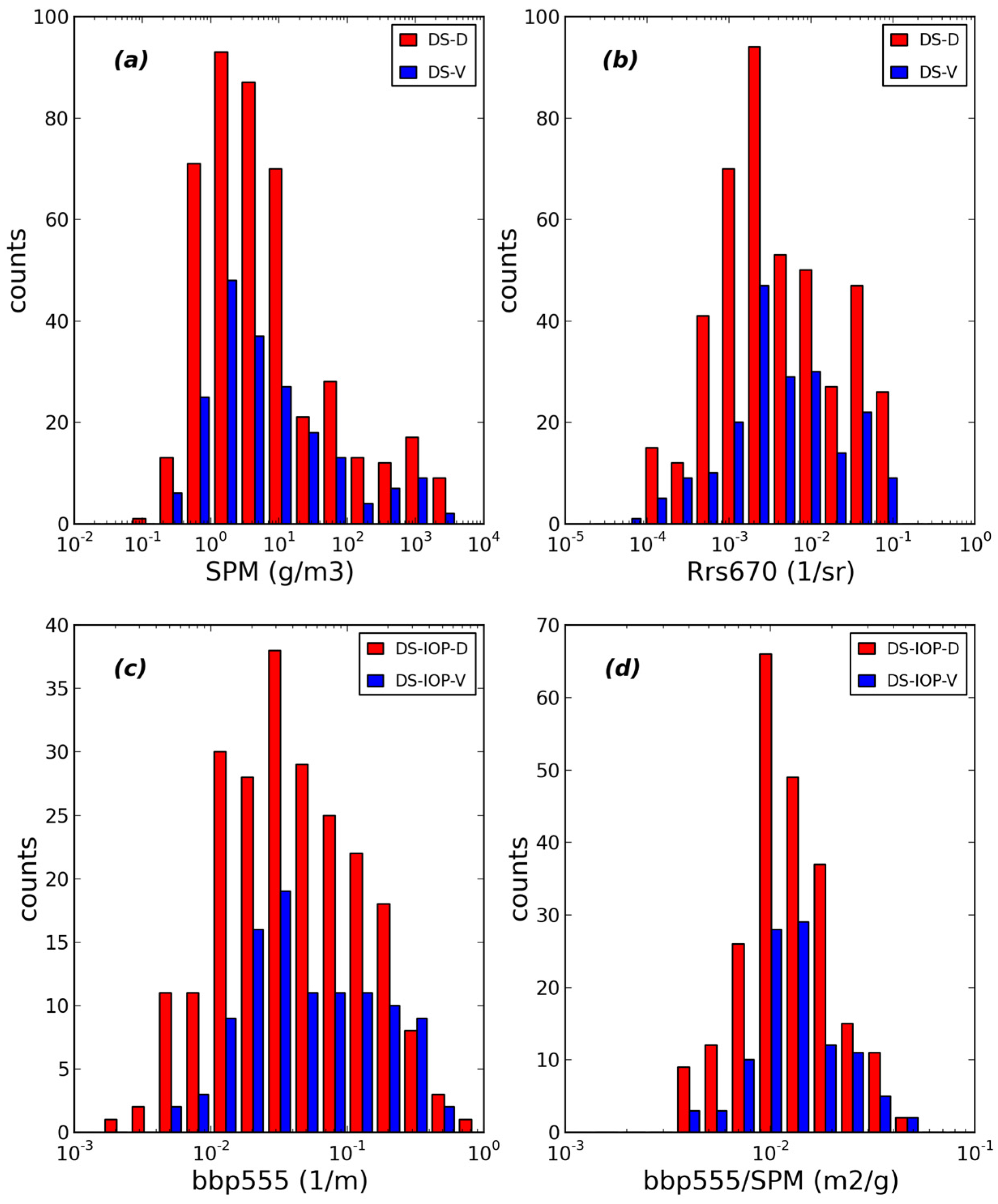 Frequency distribution of (a) SPM; (b) Rrs(670); (c) bbp(555); and (d) bbp(555)/SPM in terms of logarithmically equal interval. The data used for the development and validation are represented in red and blue, respectively.