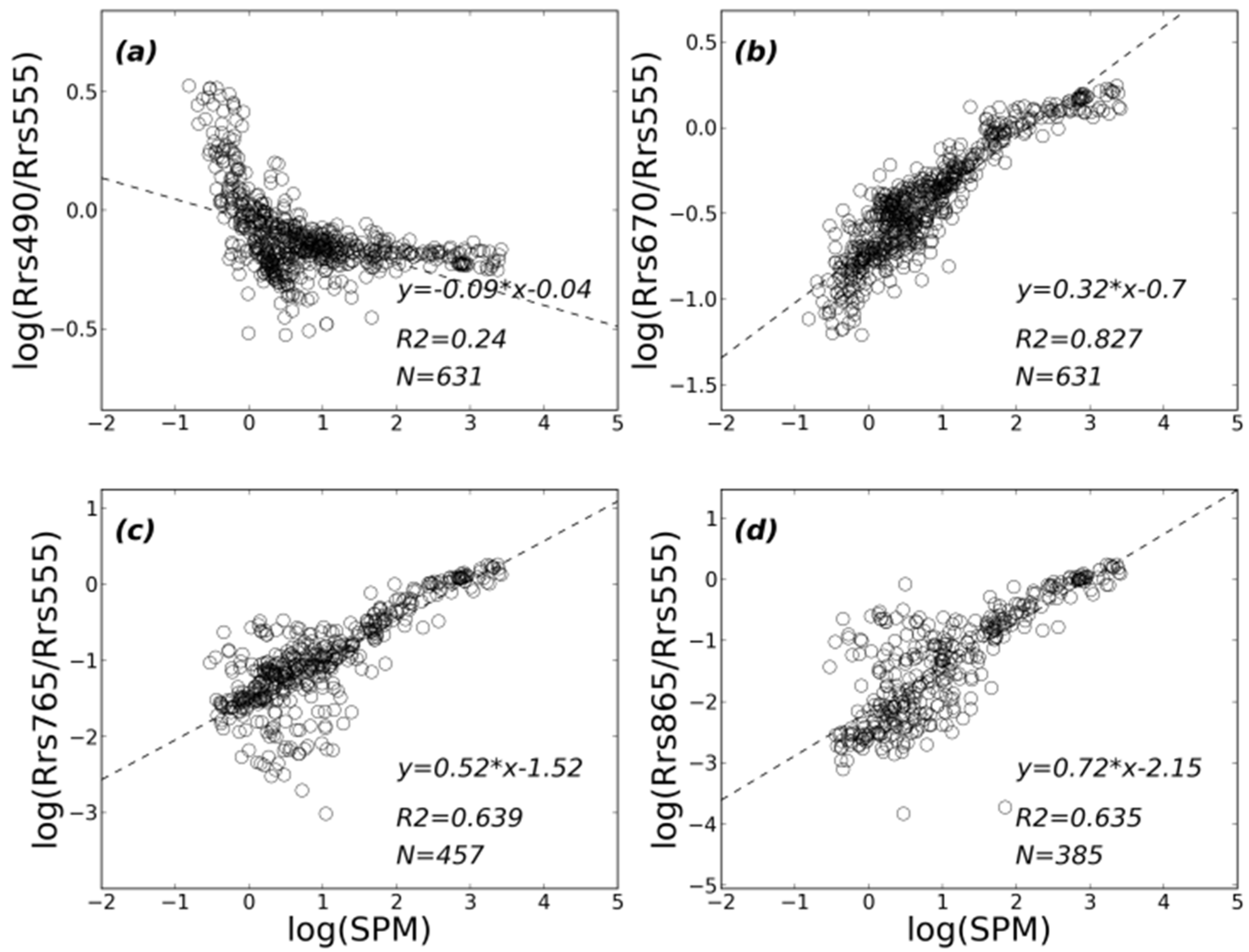 Variation of (a) Rrs(490)/Rrs(555); (b) Rrs(670)/Rrs(555); (c) Rrs(765)/Rrs(555); and (d) Rrs(865)/Rrs(555) as a function of SPM in logarithmic space. The best linear regression fit is also plotted(dashed line) in each panel.