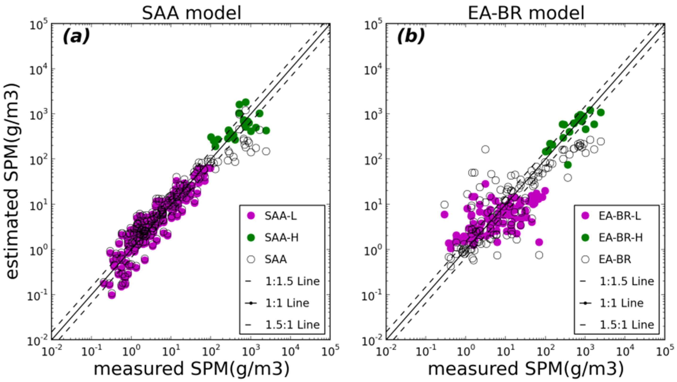 Comparison of the measured and inversed SPM values when (a) SAA; and (b) EA-BR models are applied to the DS-V in situ data set. Open, green, and pink circles stand for the version of each model developed over the Whole, High and Low SPM ranges, respectively (see Table 3). Solid lines represent 1:1 line and dashed lines represent 1.5:1, 1:1.5 lines.