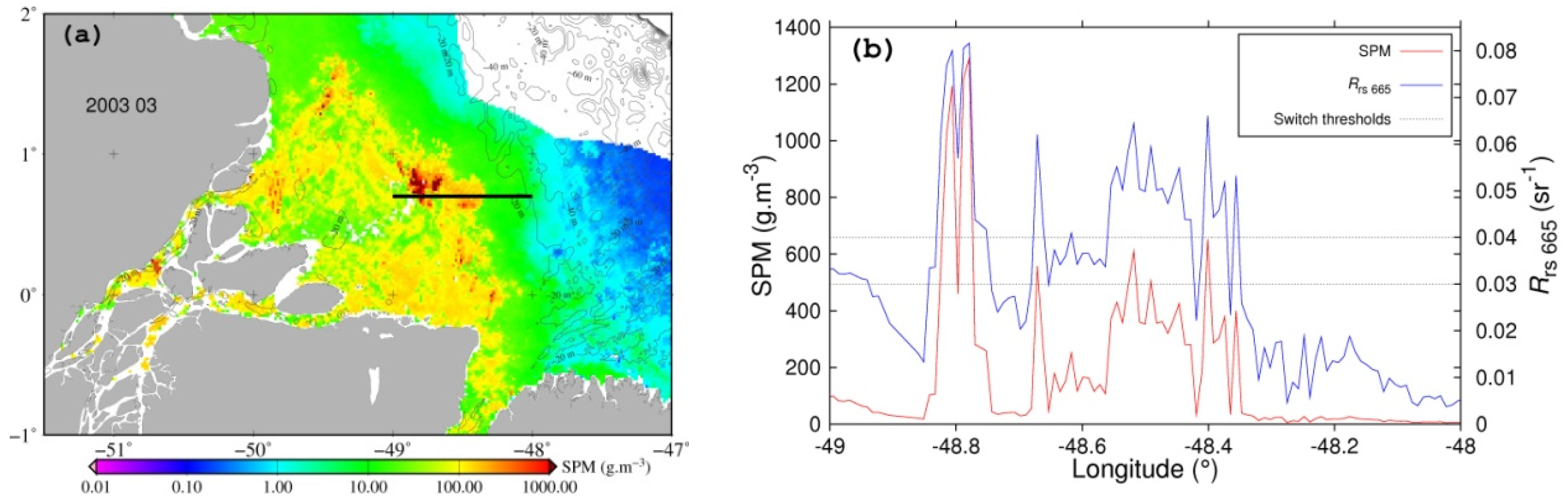 (a) Monthly SPM image (March 2003) obtained by applying the SAA generic algorithm (Equations (13)–(15)) to the monthly mean MERIS data collected over the Amazon coastal waters. The black line on the image represents the location of the transect over which the SPM and Rrs(665) data are extracted; (b) Spatial evolution of SPM and Rrs(665) along the transect. The two dashed lines indicate the adopted switching thresholds.