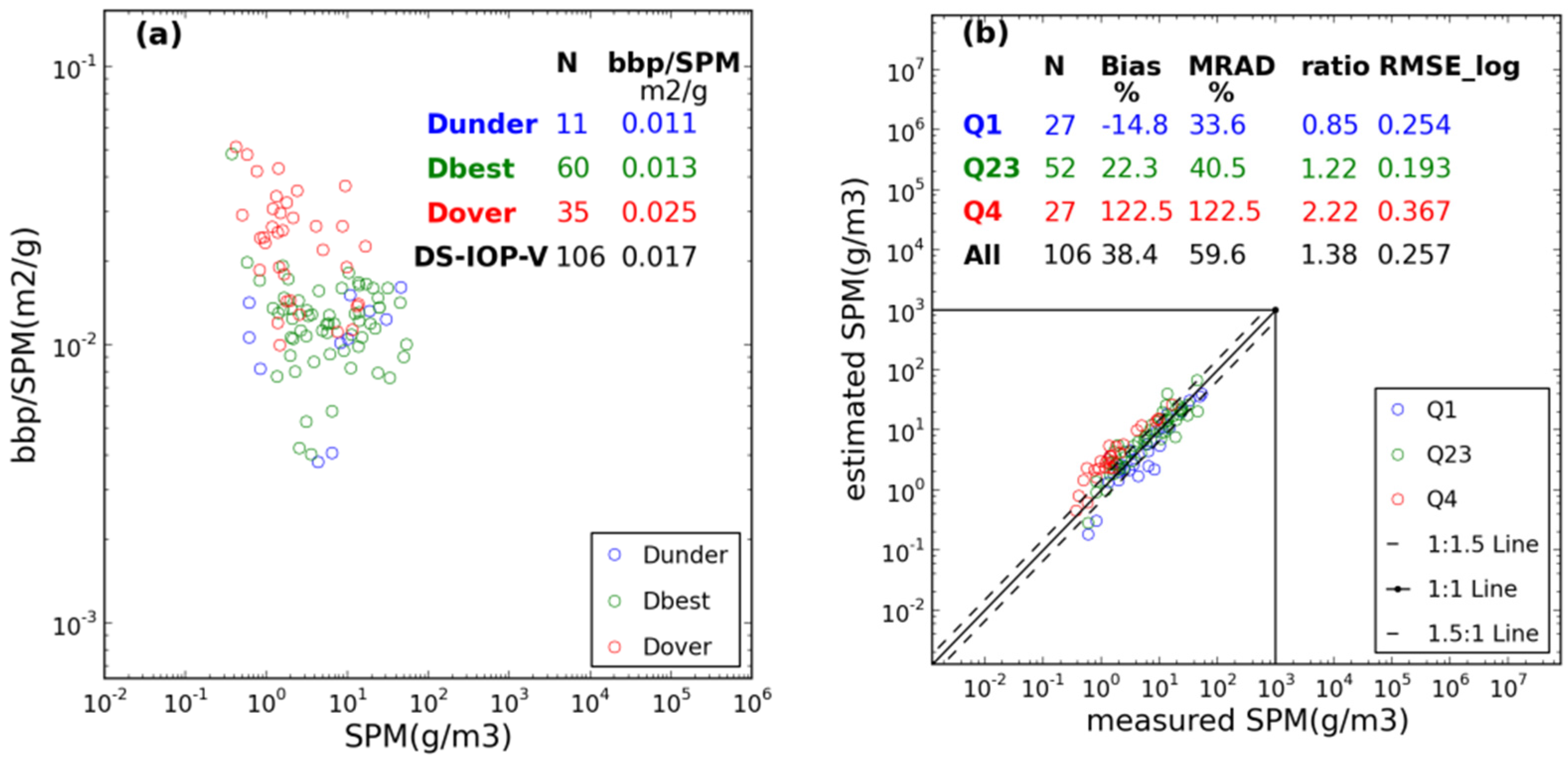 This section aims at verifying whether the accuracy of the SPM retrieval is partly linked to the SPM mass-specific backscattering coefficient () variability. This exercise is performed for the SAA algorithm only. From the SPM retrieved values using this latter algorithm (Figure 10), three subsets of data were generated based on the ratio value of estimated to measured SPM as computed from DS-IOP-V. The first group (Dover) gathers data with a ratio value greater than 1.5 (significantly over-estimated SPM), while the second group (Dunder) concerns data with a ratio lower than 1/1.5 (significantly under-estimated SPM). The remaining data points, which represent the best estimated SPM values, lie in the third group (Dbest). The mean calculated for the data points gathered into Dover (0.025 ± 0.011 m2·g−1) is about two times higher than the one calculated over Dunder (0.011±0.004 m2·g−1) (Figure 10a). Interestingly, the remaining data points for which the estimation of SPM from the SAA algorithm is relatively good, present intermediate value (0.013 ± 0.006 m2·g−1). This result strongly emphasizes that the accuracy in the SPM retrieval is tightly linked to the bulk particulate matter chemical composition and size. Higher values are, for instance, generally observed for waters where the particulate fraction is dominated by the presence of mineral particles [37]. These results regarding the impact of the specific backscattering coefficient on the SPM retrieval are in line with the study of Binding et al. (2005) [51] performed on moderately turbid waters.
