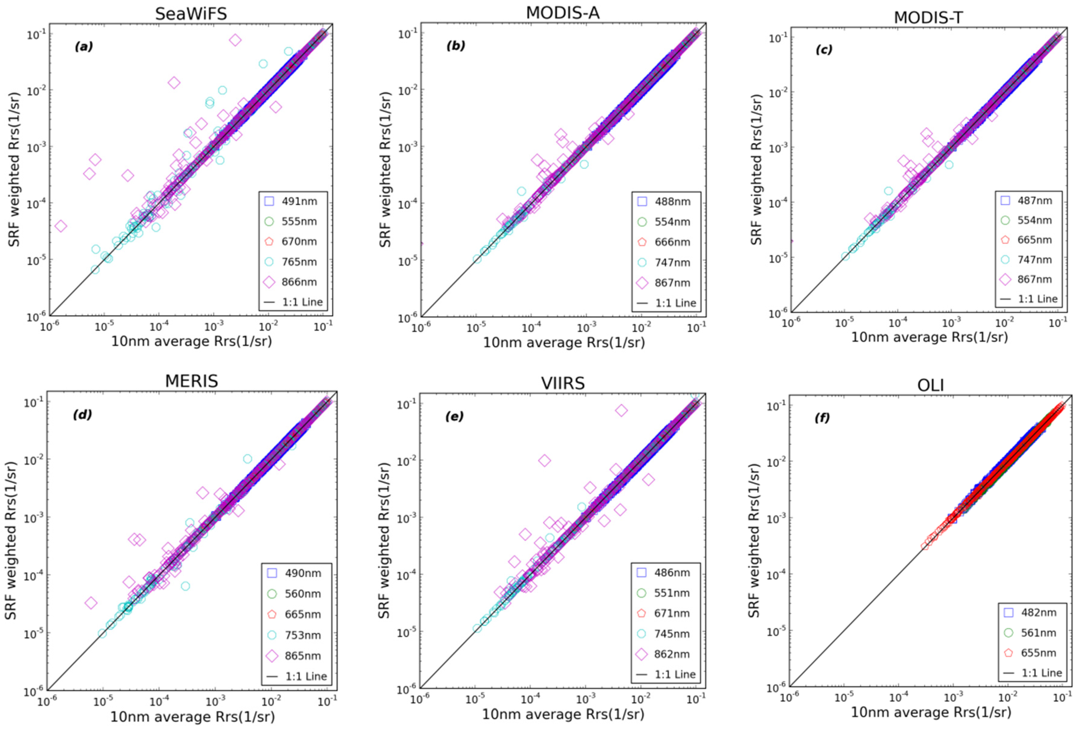 Comparison between the Rrs values averaged over a 10nm-bandwidth, and those calculated using the Spectral Response Functions for the (a) SeaWiFS; (b) MODIS-Aqua; (c) MODIS-Terra; (d) MERIS (e) VIIRS and (f) OLI sensors for visible and near-infrared channels, as indicated. Solid lines represent the 1:1 line.