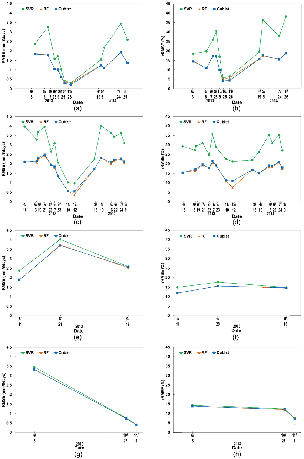 Root Mean Square Error (RMSE) and relative RMSE (rRMSE%) of Support Vector Regression (SVR), Random Forest (RF), and Cubist models at: Site 1 (a,b); Site 2 (c,d); Site 3 (e,f); and Site 4 (g,h).