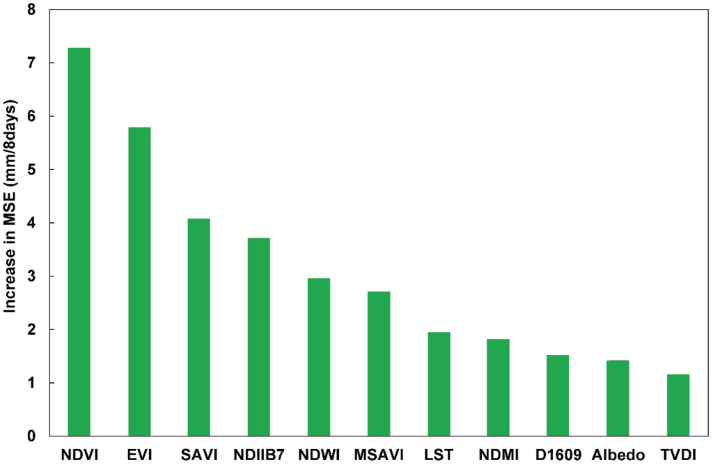 Figure 5 shows the average importance of the eleven Landsat indicators resulting from all RF models and their ranks. Importance of a variable is measured by the increase in MSE when the variable is permuted. Greater increase in MSE indicates higher importance of the variable. Table 5 shows the mean and standard deviation of linear correlation coefficients () between Landsat indicators and MODIS ET calculated at all dates or only during growing seasons. From Figure 5 and Table 5, the variable importance in RF models was largely consistent with the correlations between the variables and MODIS ET. Among the eleven indictors, NDVI, EVI, and SAVI that are related to vegetation greenness and growth conditions were ranked the most important in ET modeling. Permuting values of NDVI could lead to as much as a 7.2 mm/8 days ET bias. The correlation coefficients between these variables and MODIS ET were also highest with positive relationships ( > 0.69 when averaged at all dates and > 0.73 during growing seasons, p-value < 0.0001).